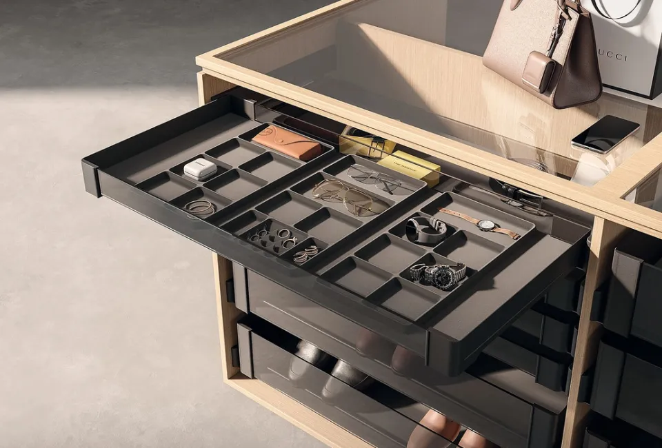 - Klasični niski unutarnji izvlačni element nadopunjen je raznim dodacima za organiziranje prstenja, ogrlica, sunčanih naočala i još mnogo toga.