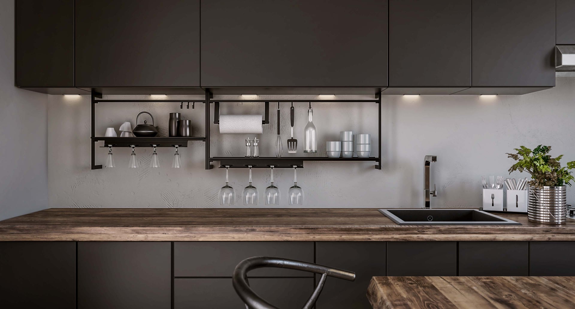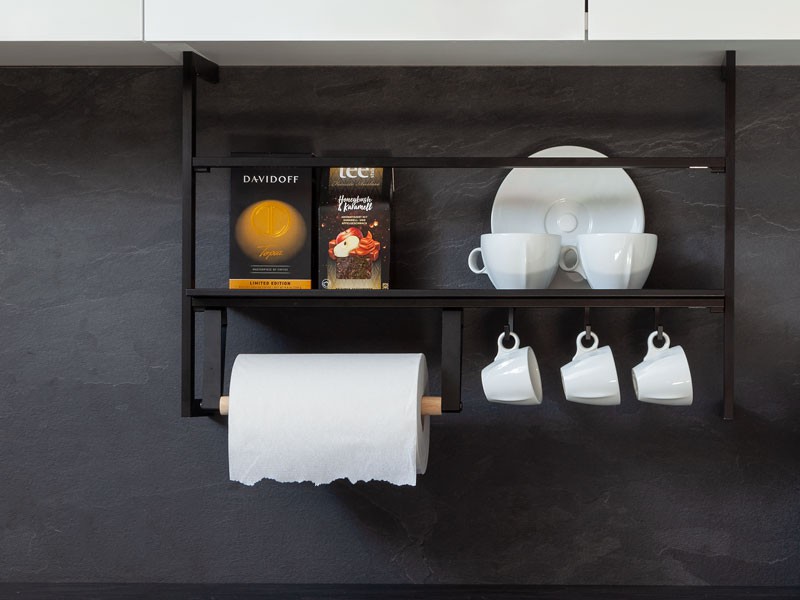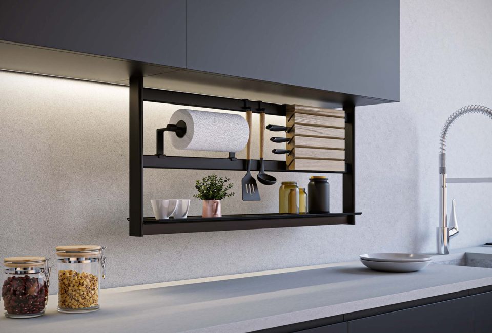 UP će zahvaljujući svome modernom dizajnu zauzeti svoje mjesto u svakoj modernoj kuhinji. Metalnu rešetku jednostavno treba pričvrstiti na gornji ormarić. Bušenje stražnje stijenke ili pločica nije potrebno za njegovu montažu, tako da naknadno svoj namještaj možemo učiniti praktičnijim. Prednost je što se još uvijek može iskoristiti puna dubina naše radne ploče, čime se štedi dragocjeni prostor.