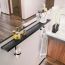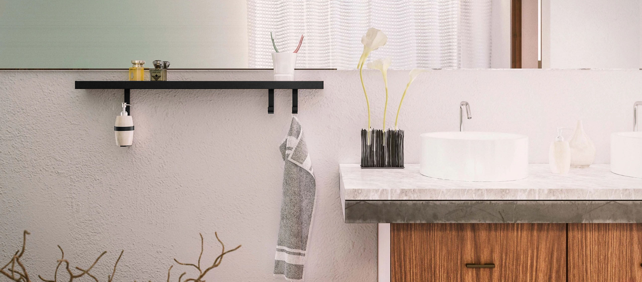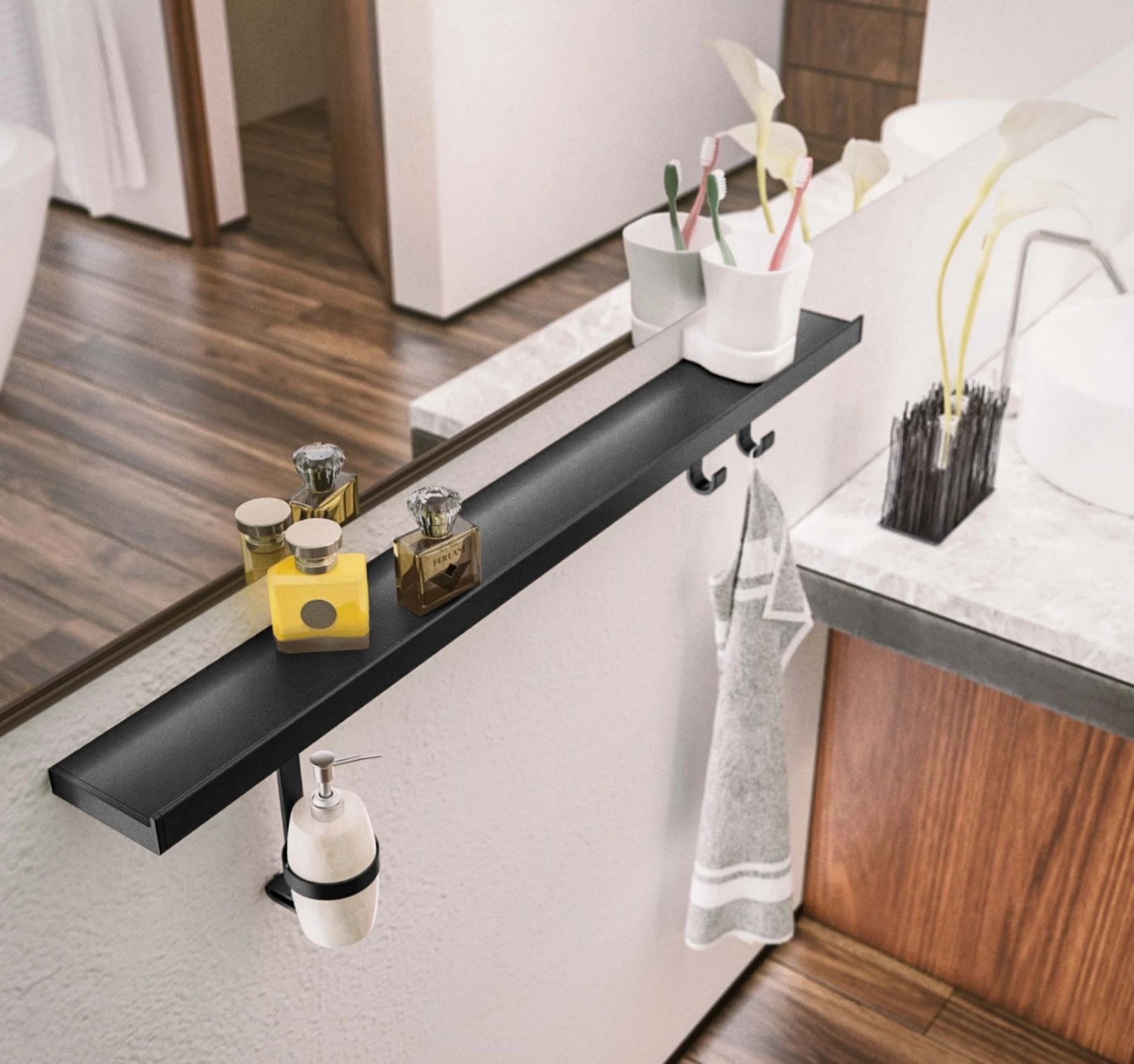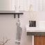 Profil na dnu police služi za vješanje pribora: dostupne su jednostavne vješalice, držač papirnatih ručnika i držač za čaše.