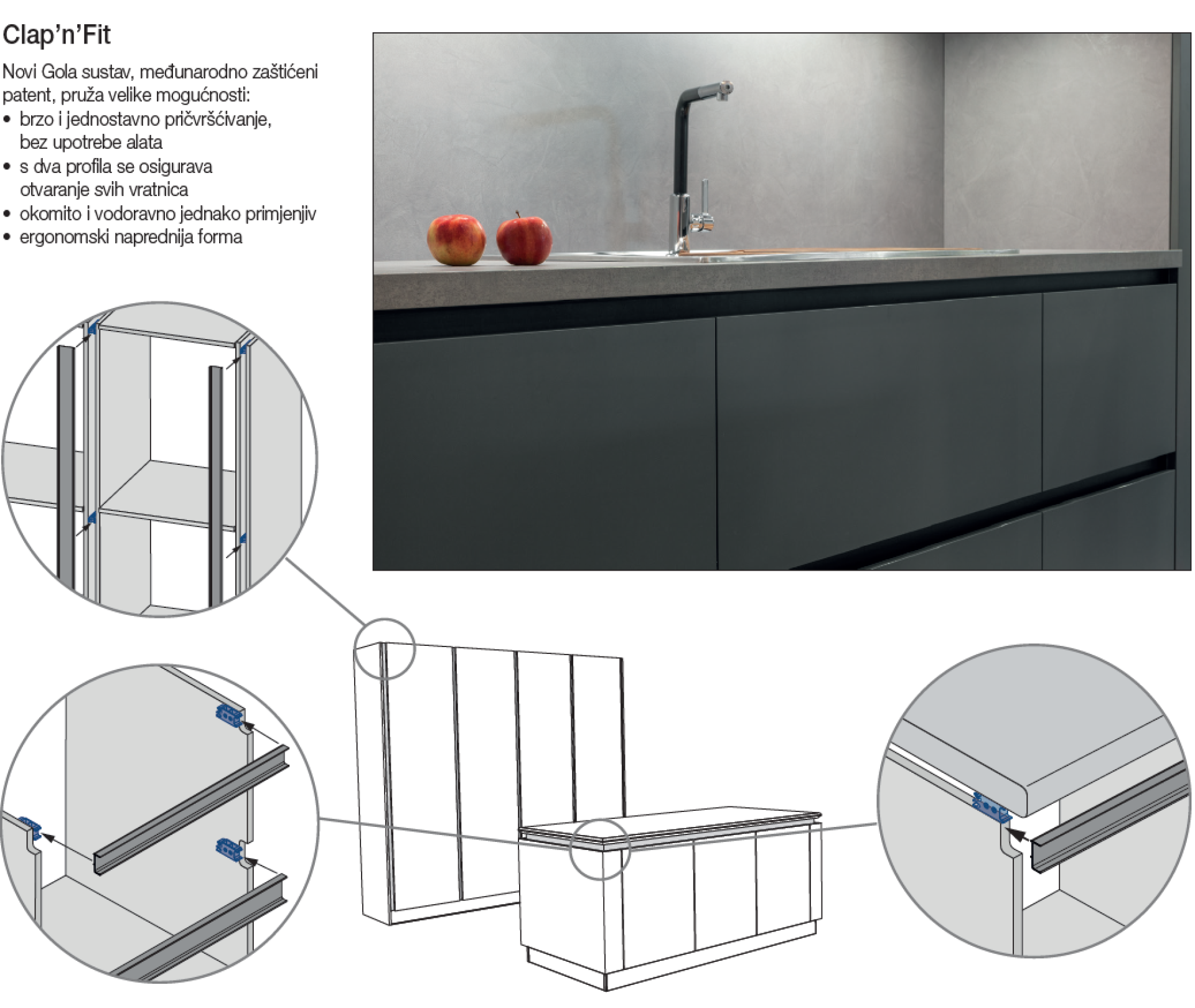 Gola clap 'n' profili dostupni su u tri boje : aluminij,bijela i crne. Profilna ručkica dužine je 4200mm.