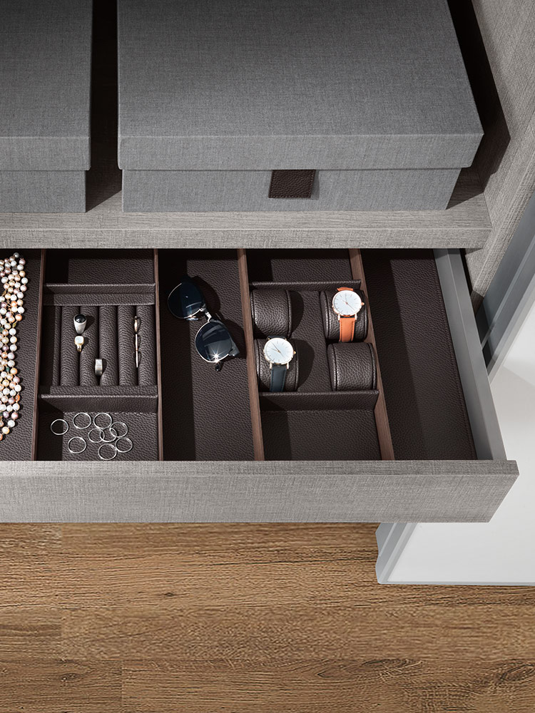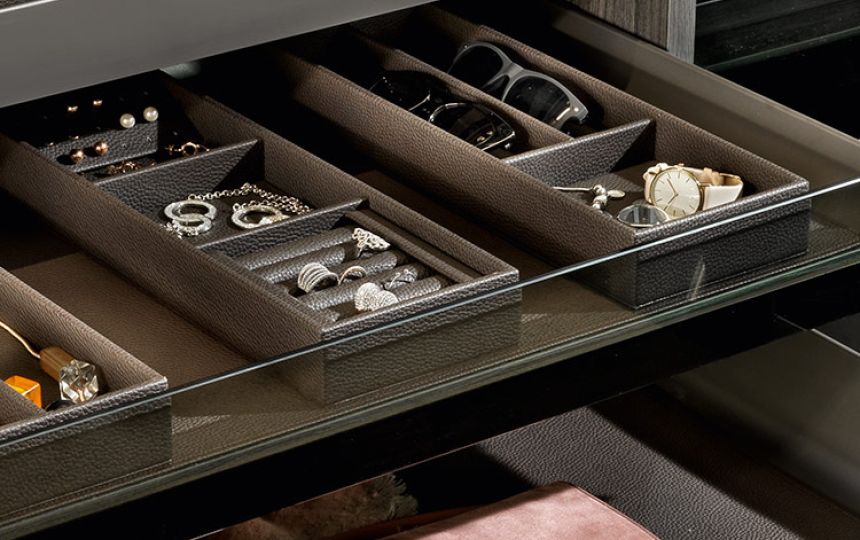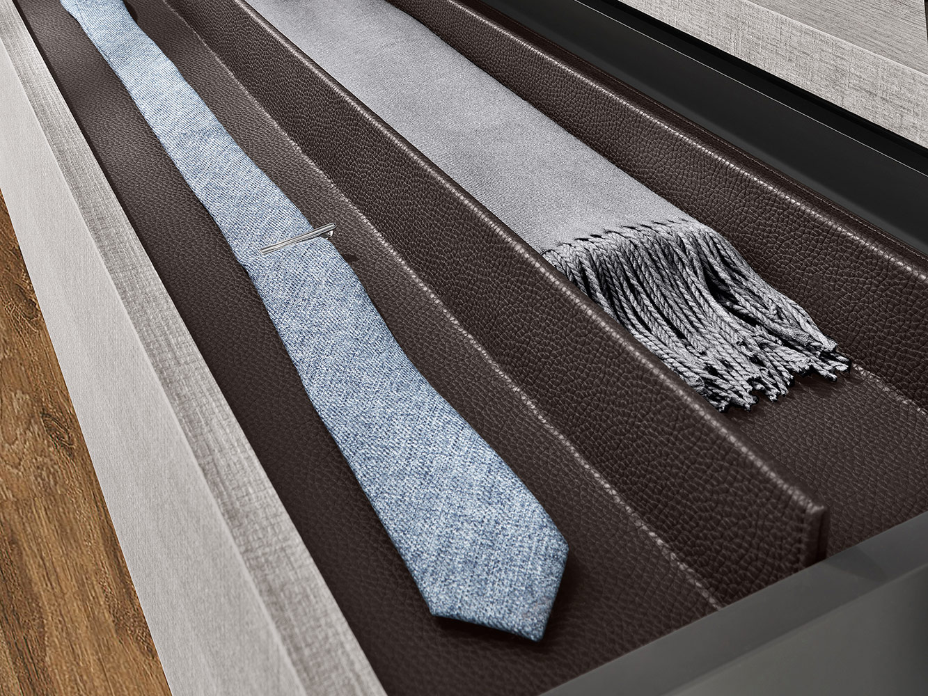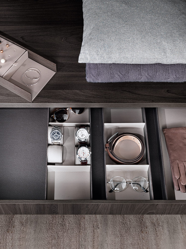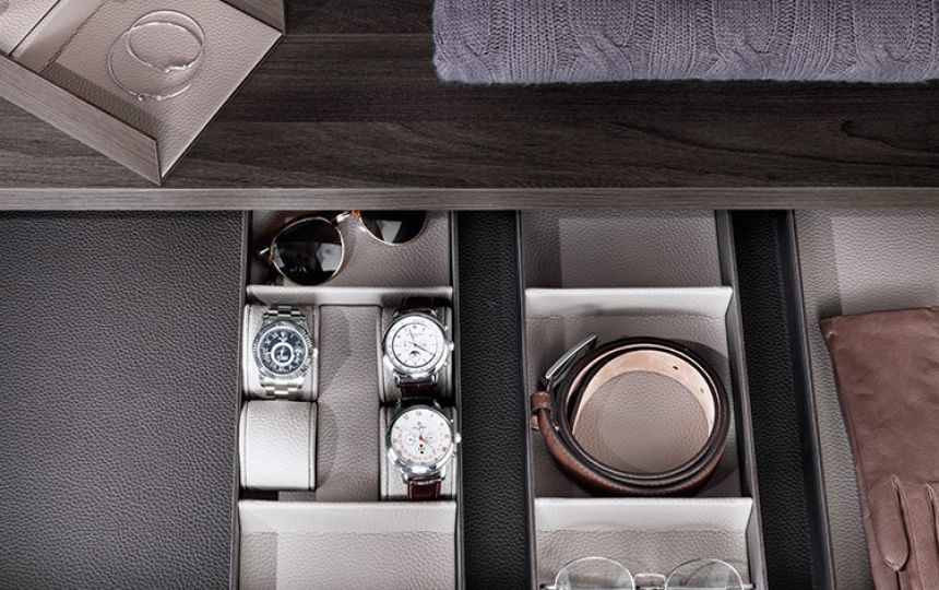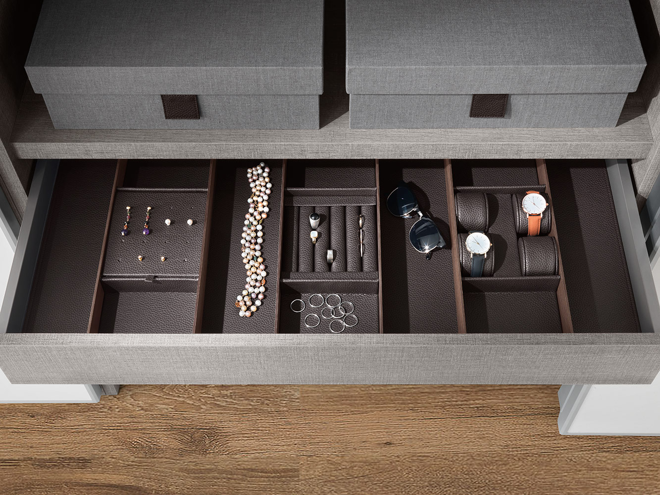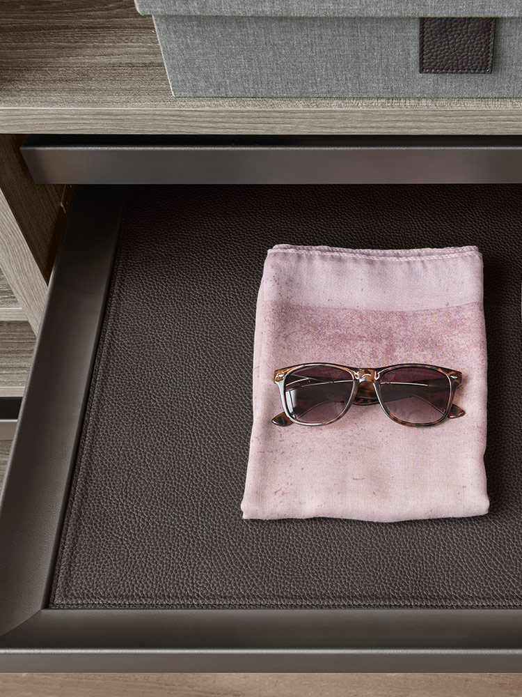 Dno ladice može se personalizirati i nadopuniti višenamjenskim kožnim ladicama ili ladicama za satove, prstenje i naušnice.