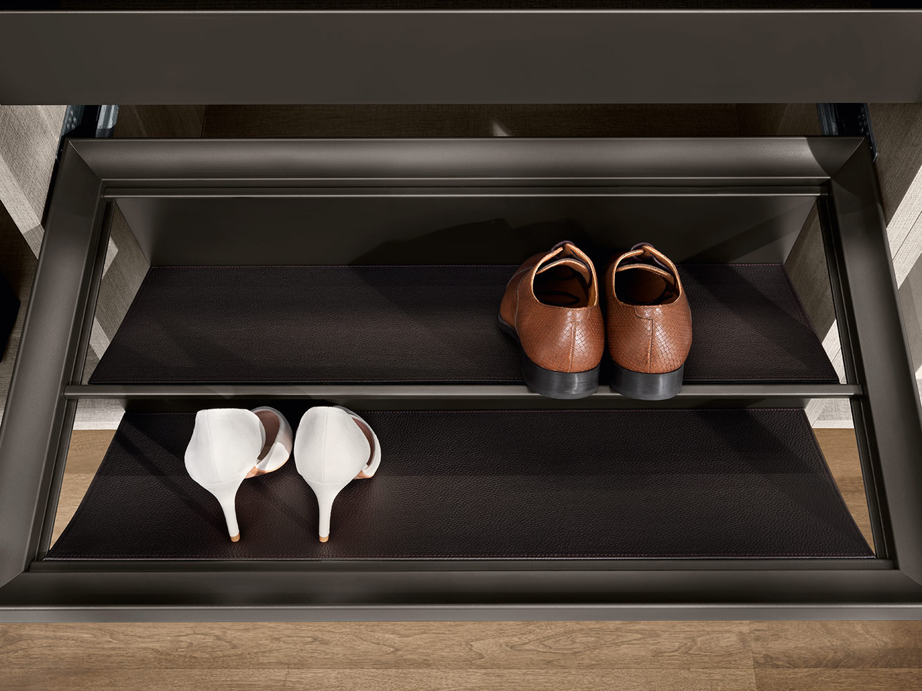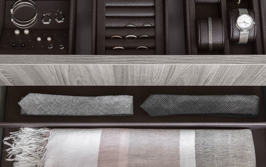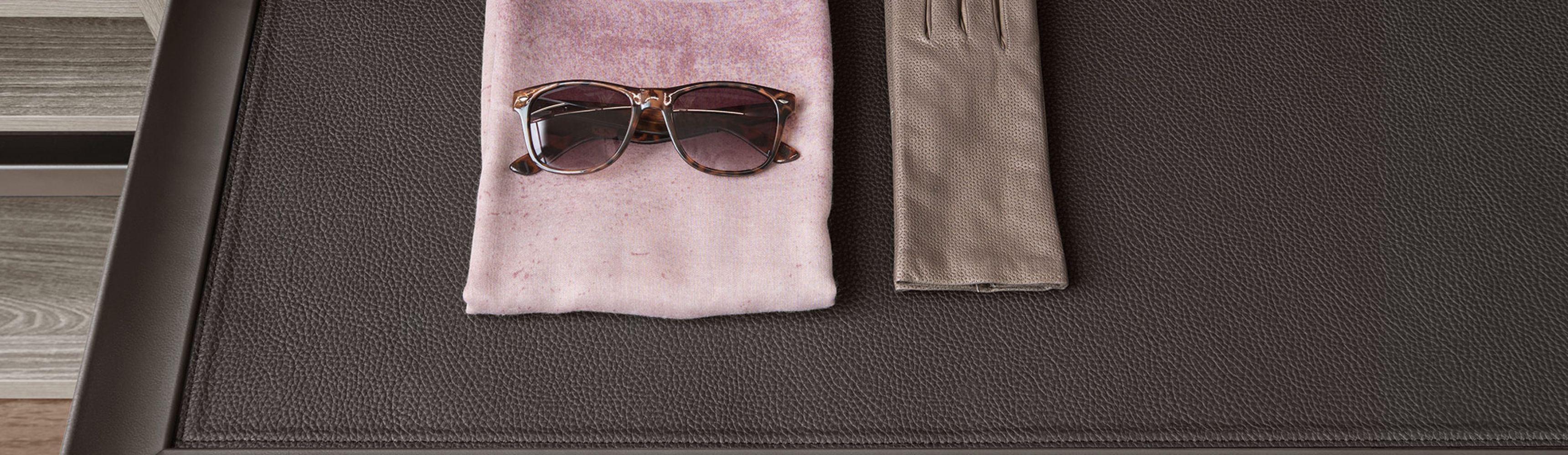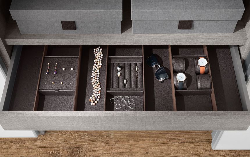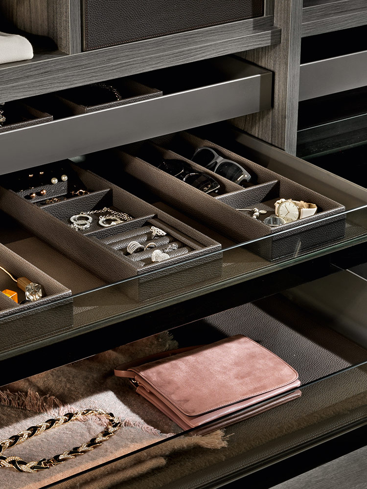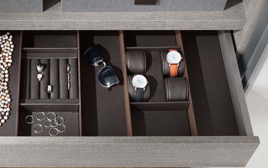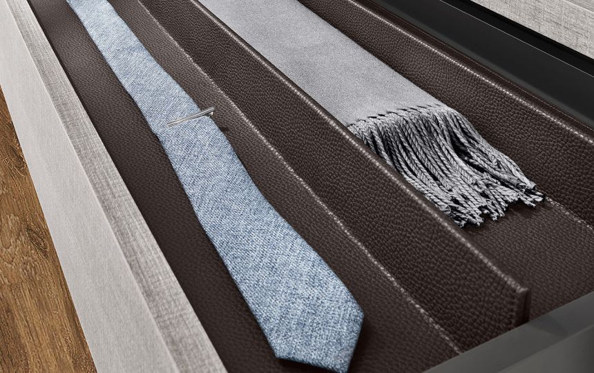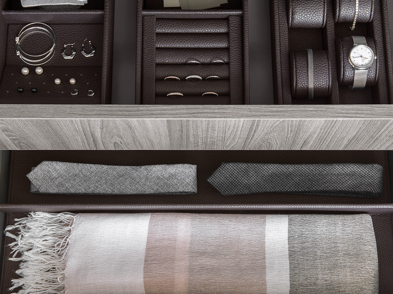 Dno ladice može se personalizirati i nadopuniti višenamjenskim kožnim ladicama ili ladicama za satove, prstenje i naušnice.