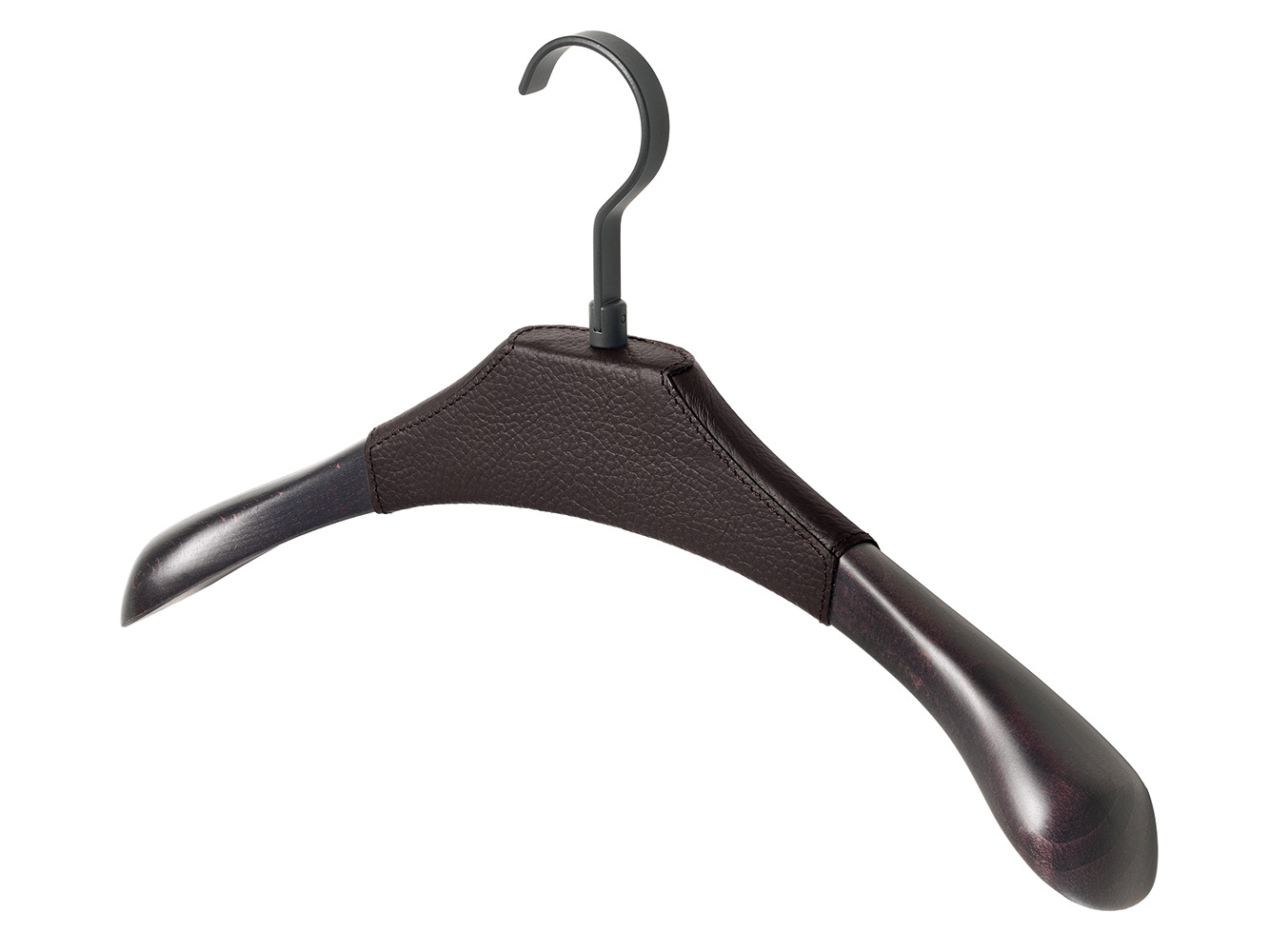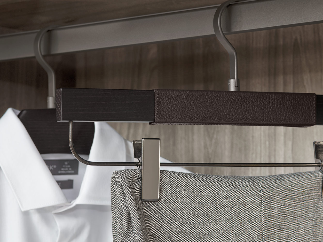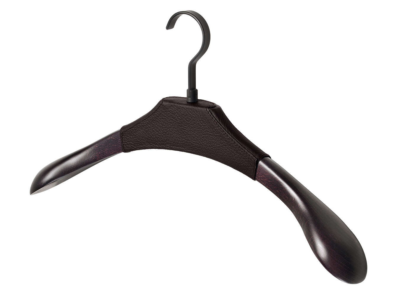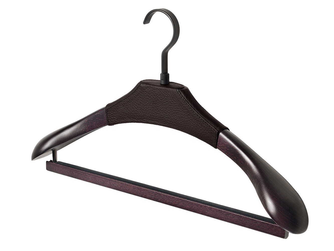 Vješalice, vješalice za odjeću i torbe, držači za šalove, kravate i remenje izrađeni od bukovog drva bajcanog u wenge nijansi sada se mogu u potpunosti personalizirati s vrijednim umetcima ili kožnim nosačima u brojnim mogućim kombinacijama.