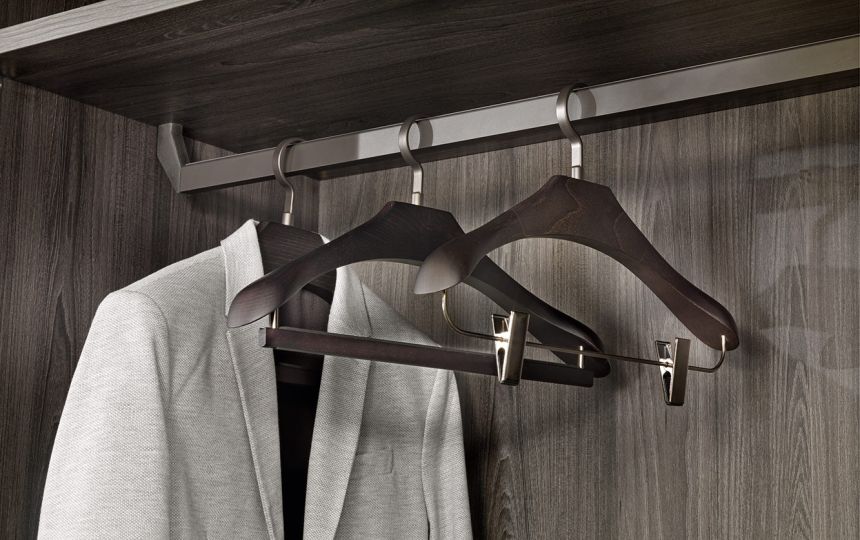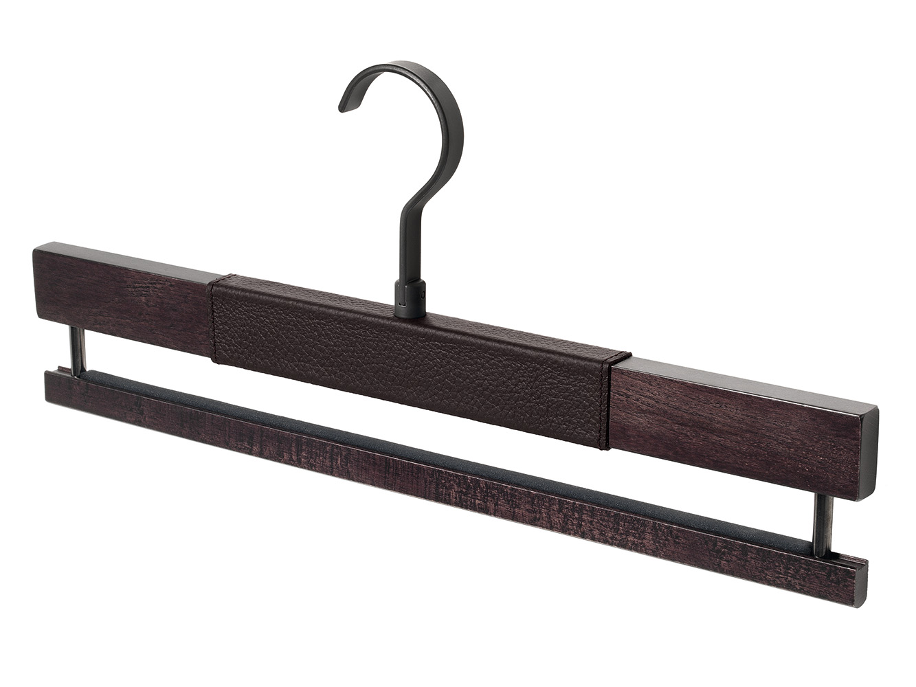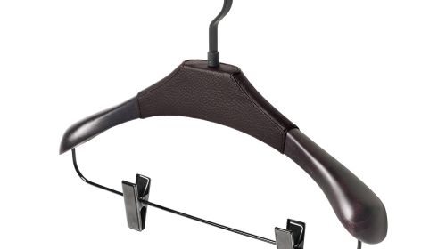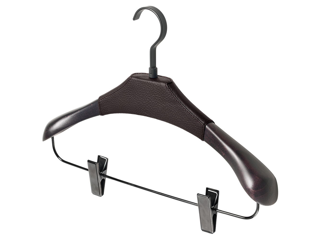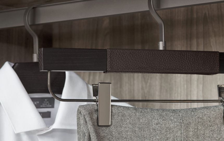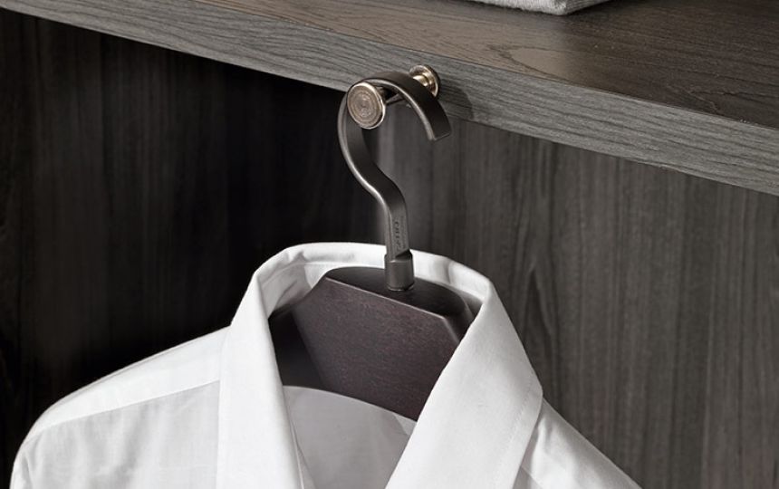 Vješalice, vješalice za odjeću i torbe, držači za šalove, kravate i remenje izrađeni od bukovog drva bajcanog u wenge nijansi sada se mogu u potpunosti personalizirati s vrijednim umetcima ili kožnim nosačima u brojnim mogućim kombinacijama.
