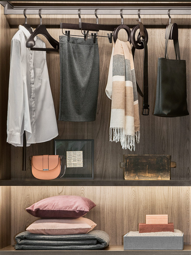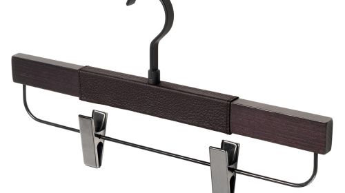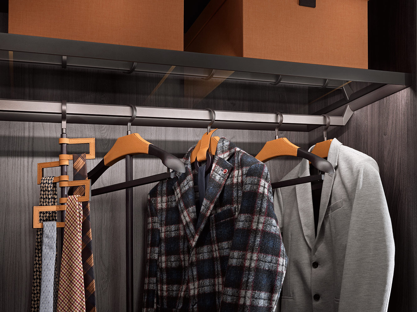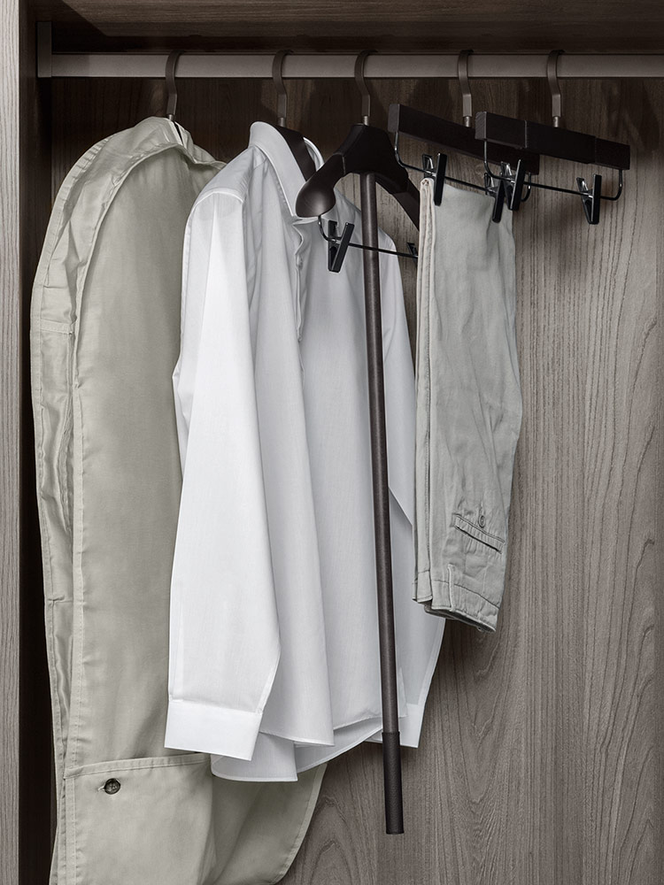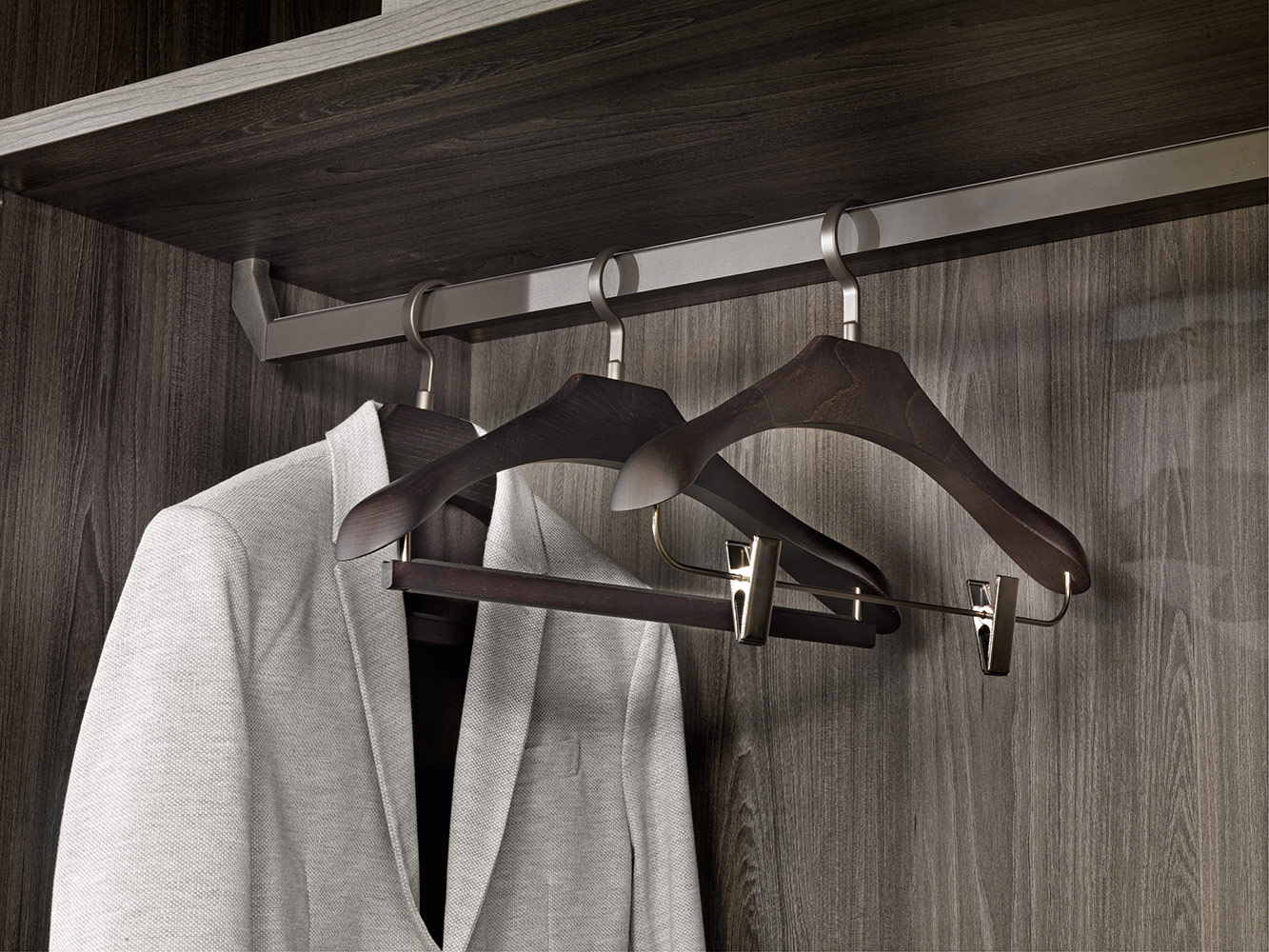 Vješalice, vješalice za odjeću i torbe, držači za šalove, kravate i remenje izrađeni od bukovog drva bajcanog u wenge nijansi sada se mogu u potpunosti personalizirati s vrijednim umetcima ili kožnim nosačima u brojnim mogućim kombinacijama.