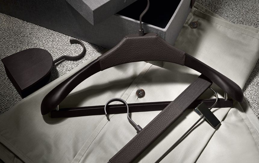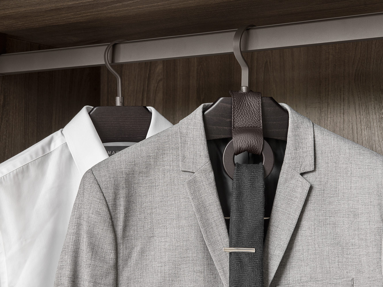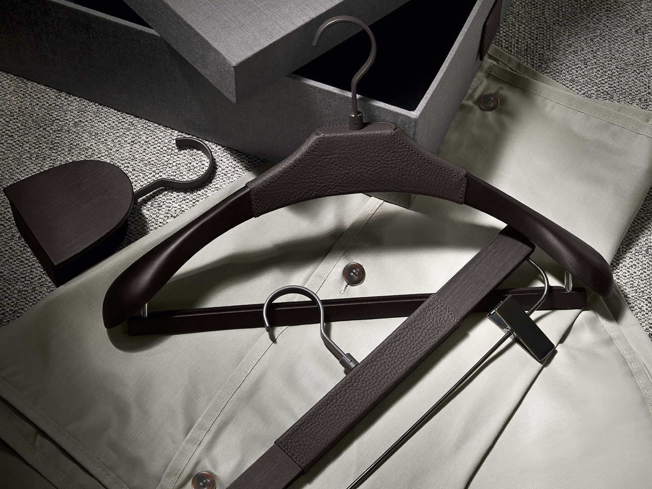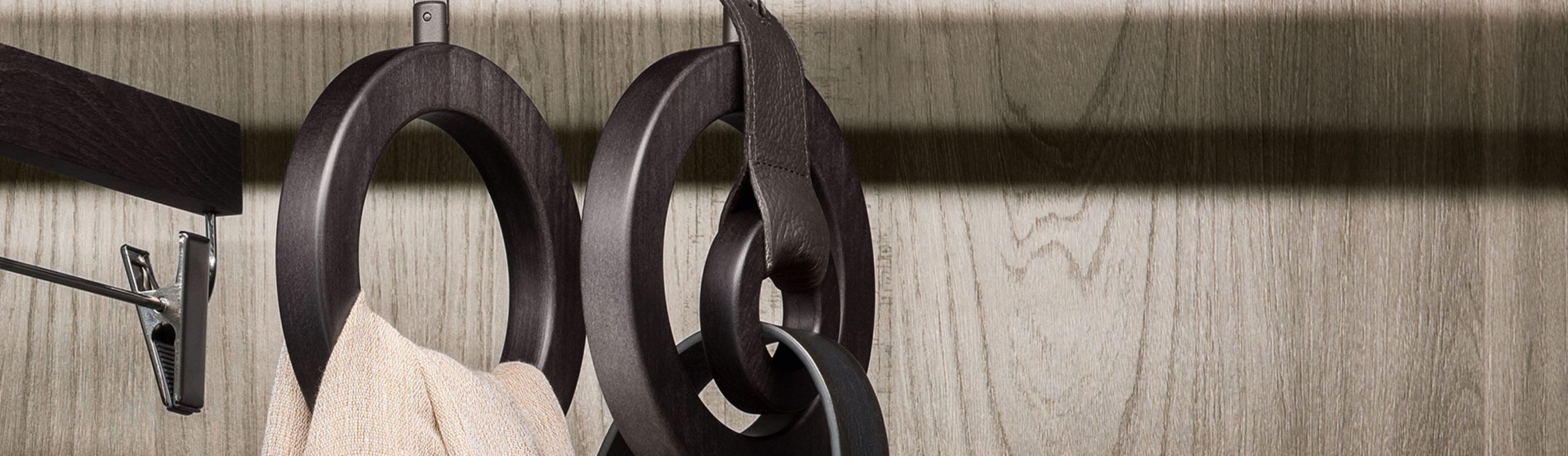 Vješalice, vješalice za odjeću i torbe, držači za šalove, kravate i remenje izrađeni od bukovog drva bajcanog u wenge nijansi sada se mogu u potpunosti personalizirati s vrijednim umetcima ili kožnim nosačima u brojnim mogućim kombinacijama.