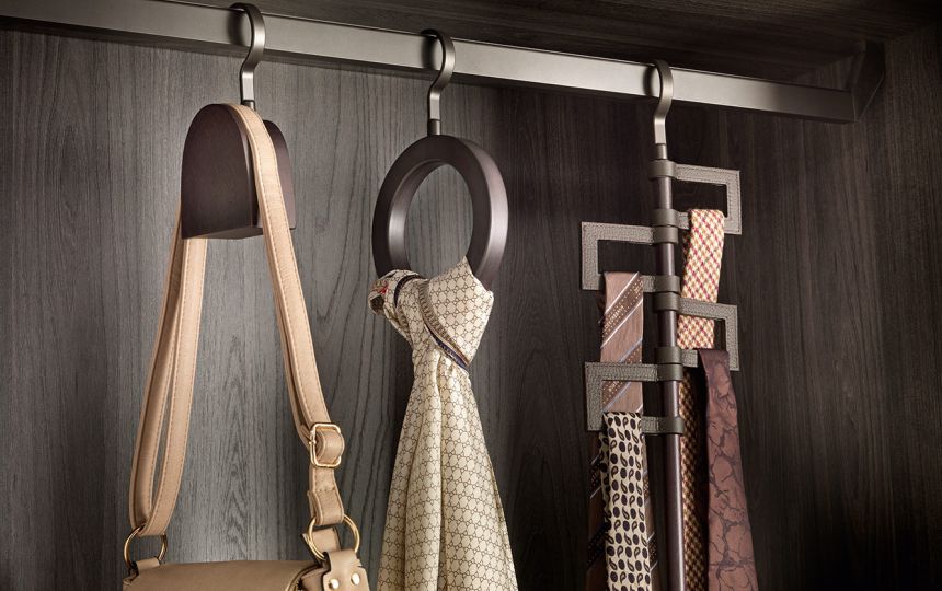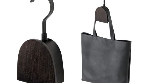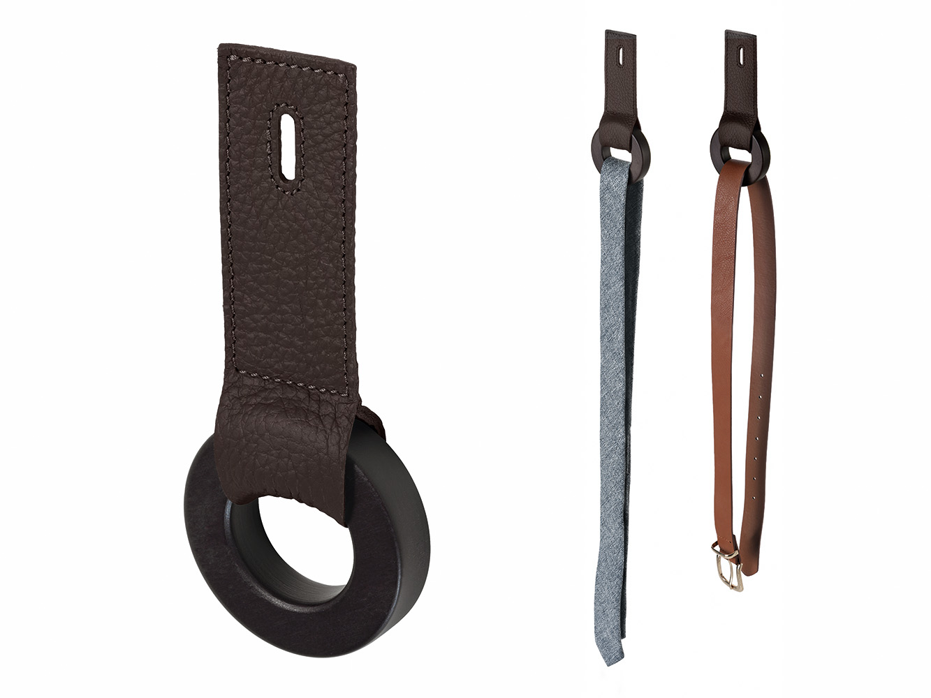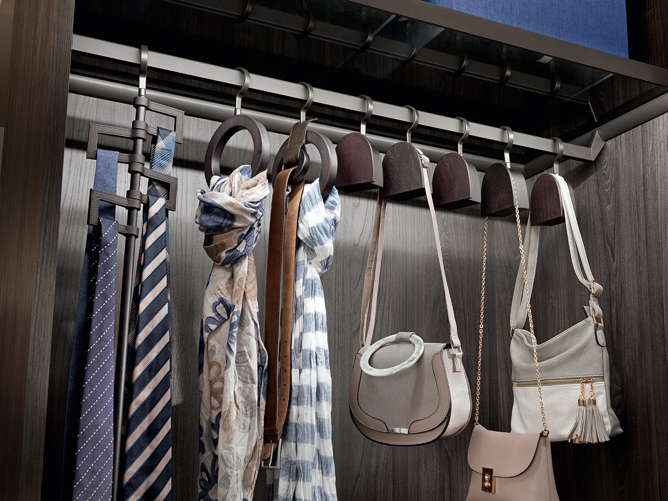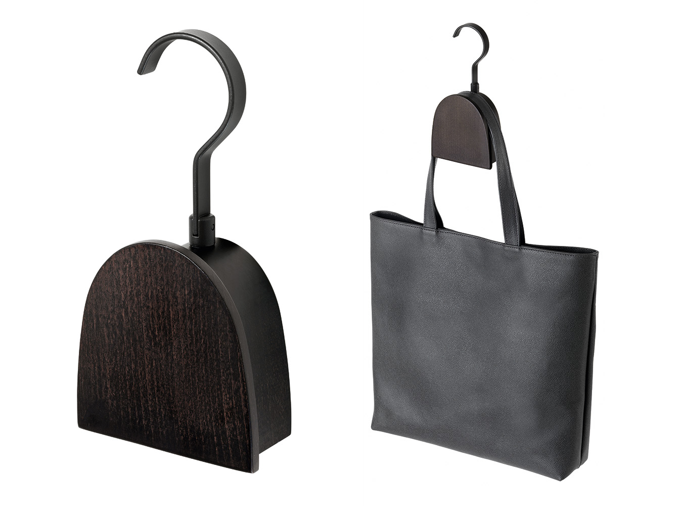 Vješalice, vješalice za odjeću i torbe, držači za šalove, kravate i remenje izrađeni od bukovog drva bajcanog u wenge nijansi sada se mogu u potpunosti personalizirati s vrijednim umetcima ili kožnim nosačima u brojnim mogućim kombinacijama.