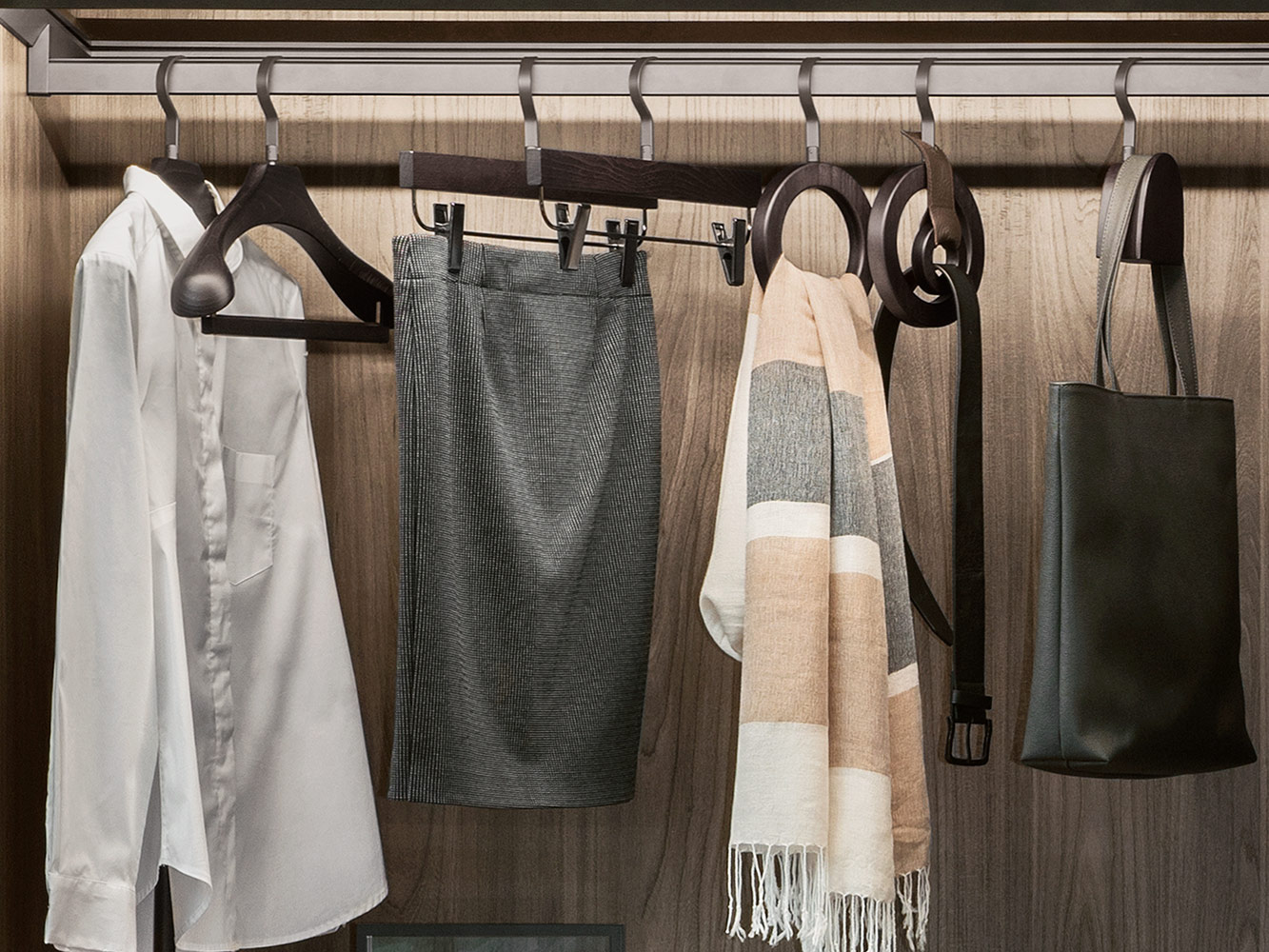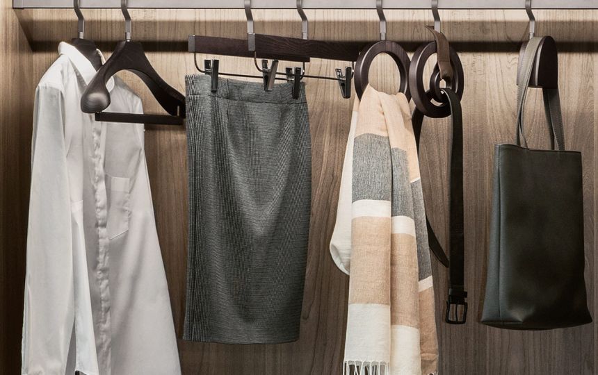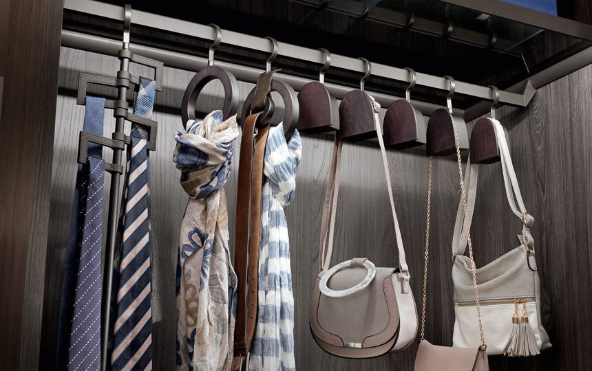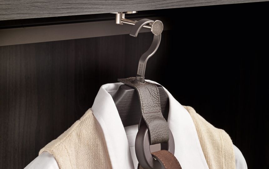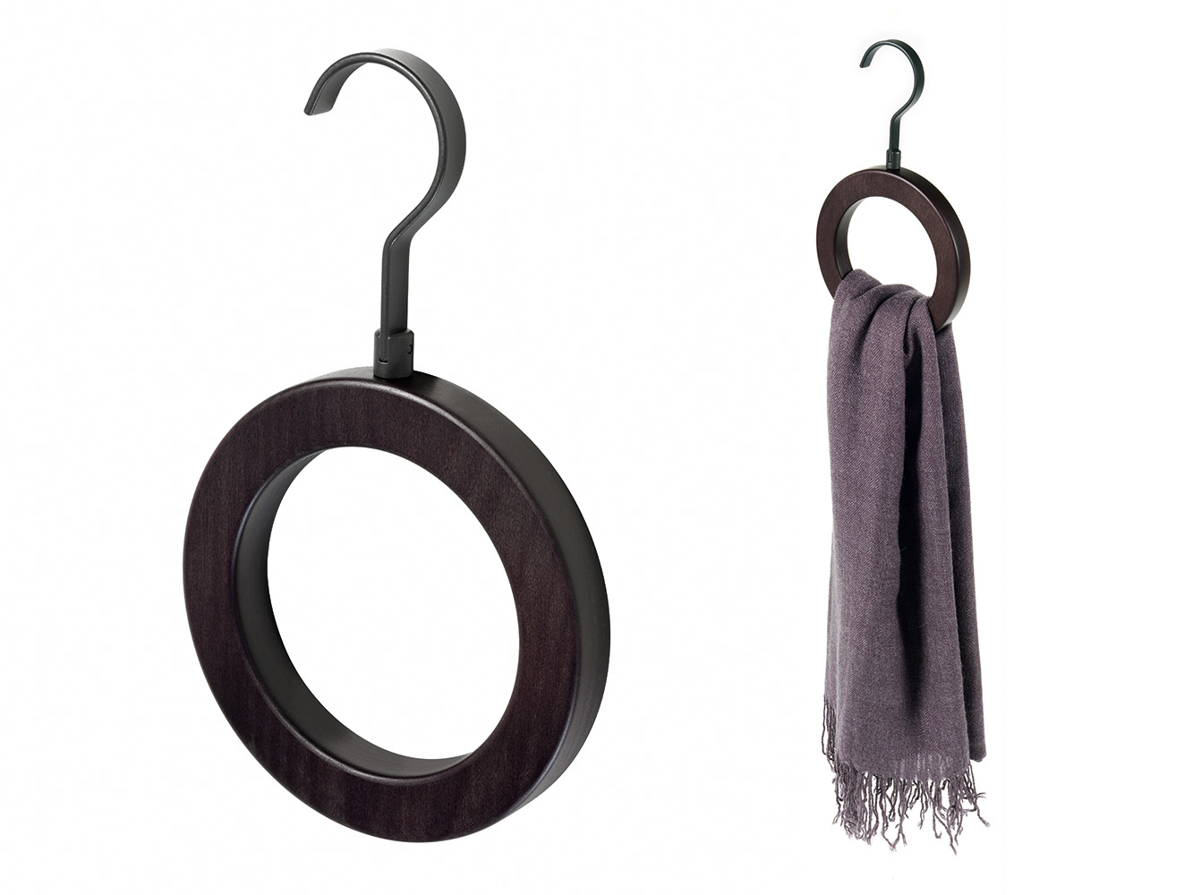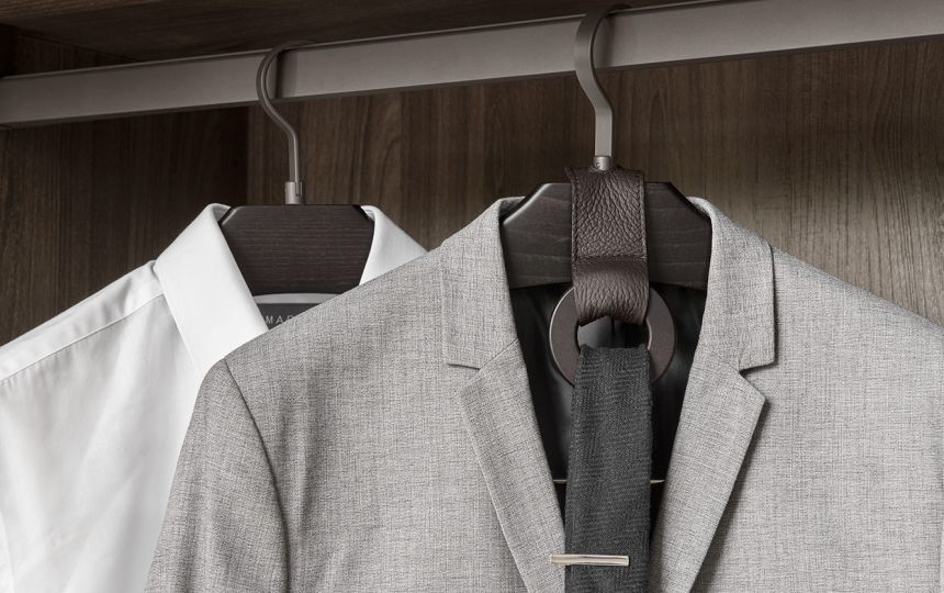 Vješalice, vješalice za odjeću i torbe, držači za šalove, kravate i remenje izrađeni od bukovog drva bajcanog u wenge nijansi sada se mogu u potpunosti personalizirati s vrijednim umetcima ili kožnim nosačima u brojnim mogućim kombinacijama.