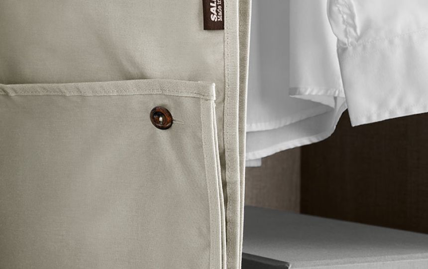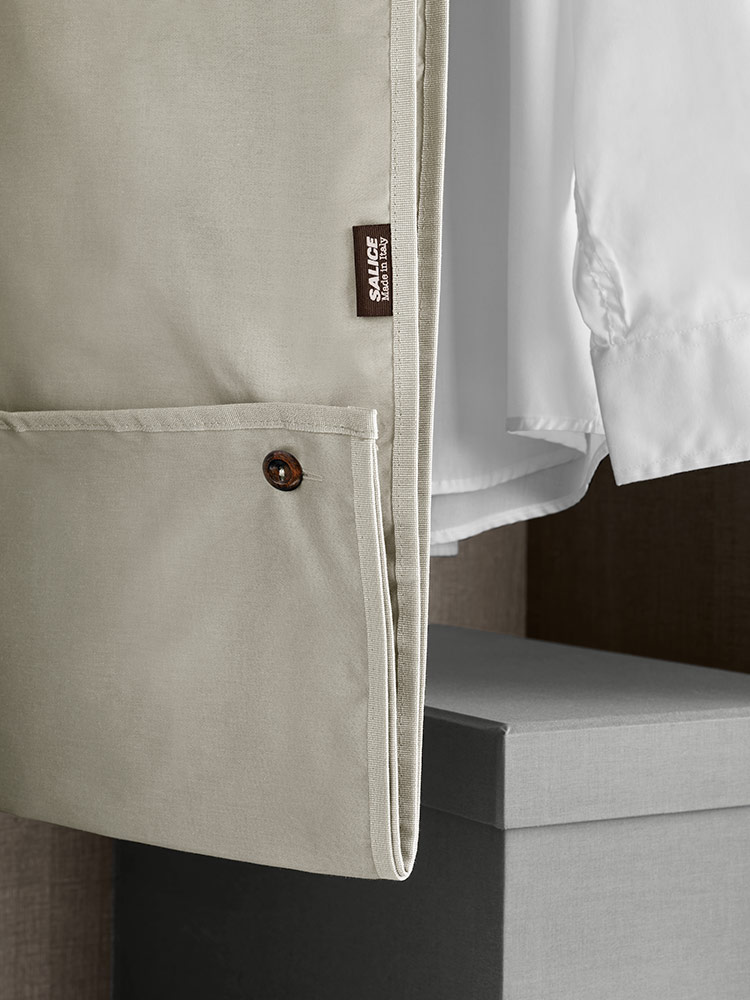Tekstilne vreće za pohranu, podesive po visini i s naborima za jednostavno spremanje glomaznije odjeće, izrađene su od 100% pamuka i dostupne u raznim bojama. Elegantne vreće za kapute mogu se sklopiti pomoću gumba.