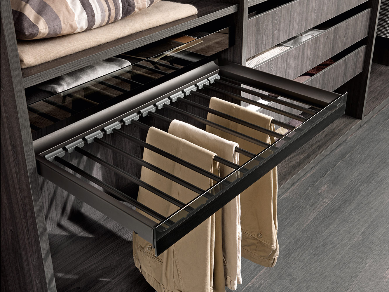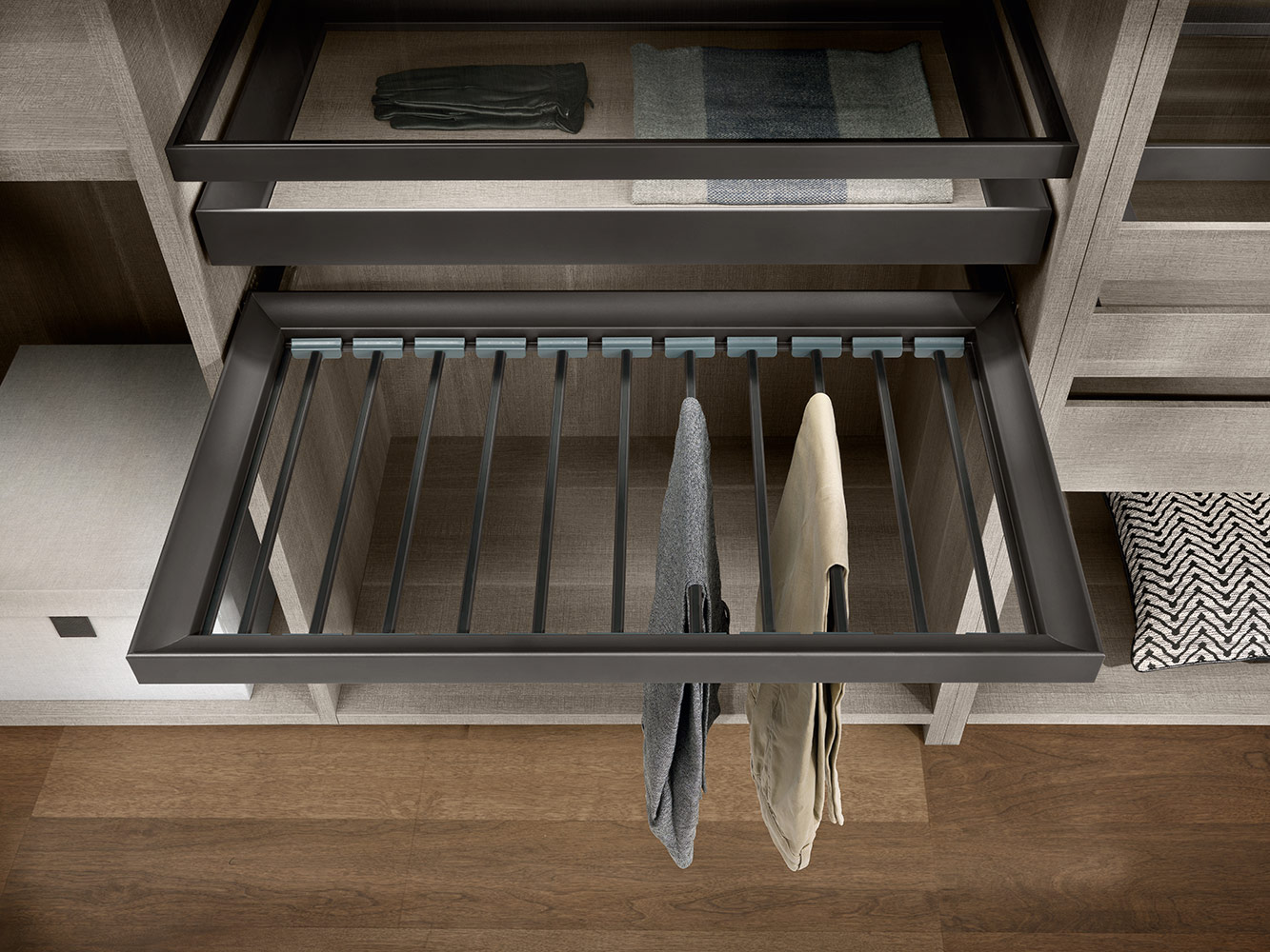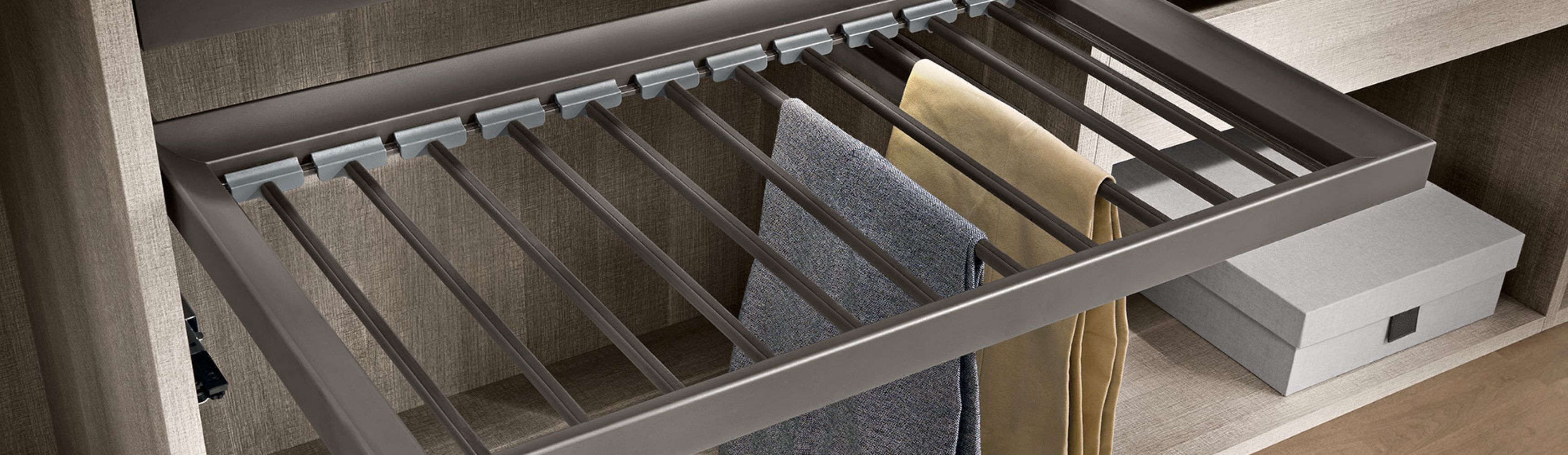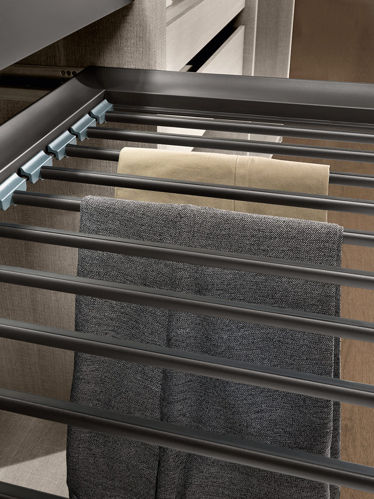 Kolekcija uključuje različite dodatke za ladice: vješalice za hlače i suknje, žičane ili metalne nosače za obuću te pretince za posteljinu izrađene od prošivene tkanine.