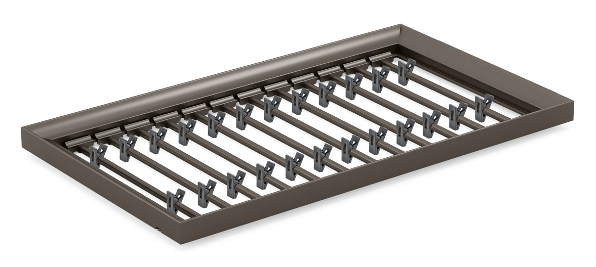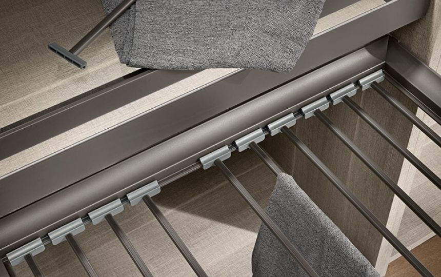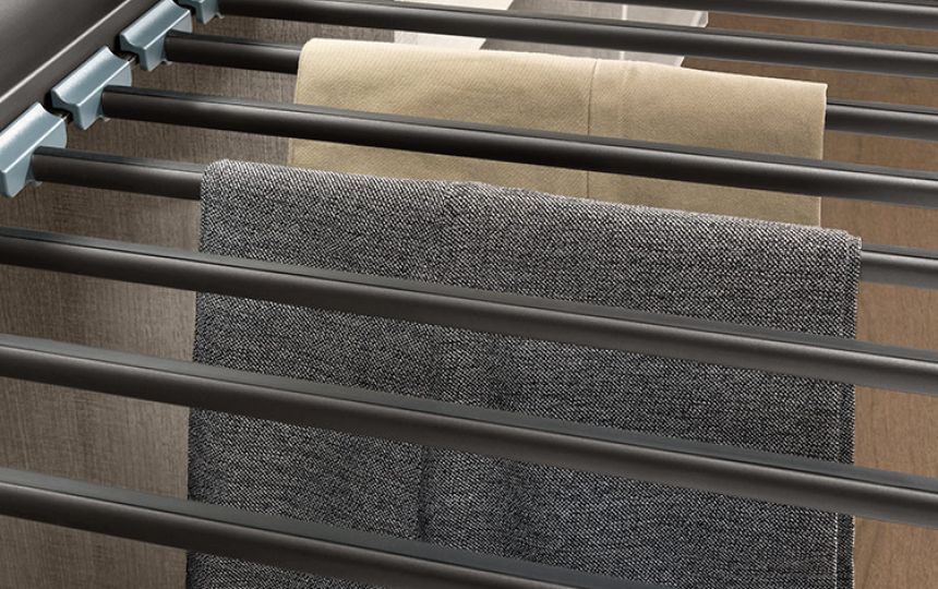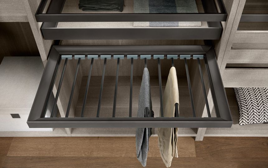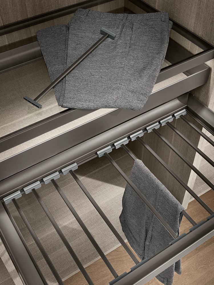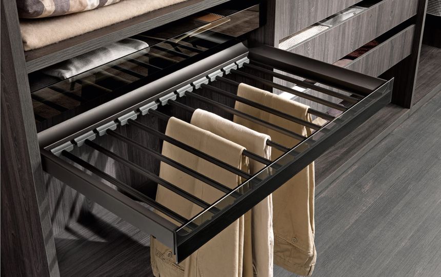 Kolekcija uključuje različite dodatke za ladice: vješalice za hlače i suknje, žičane ili metalne nosače za obuću te pretince za posteljinu izrađene od prošivene tkanine.