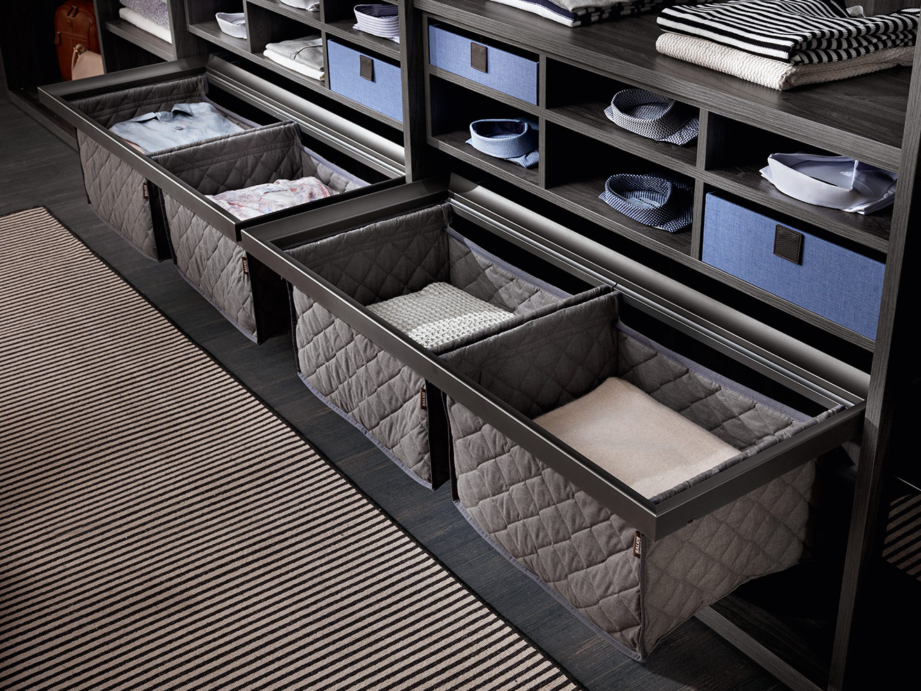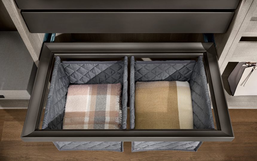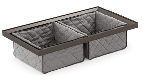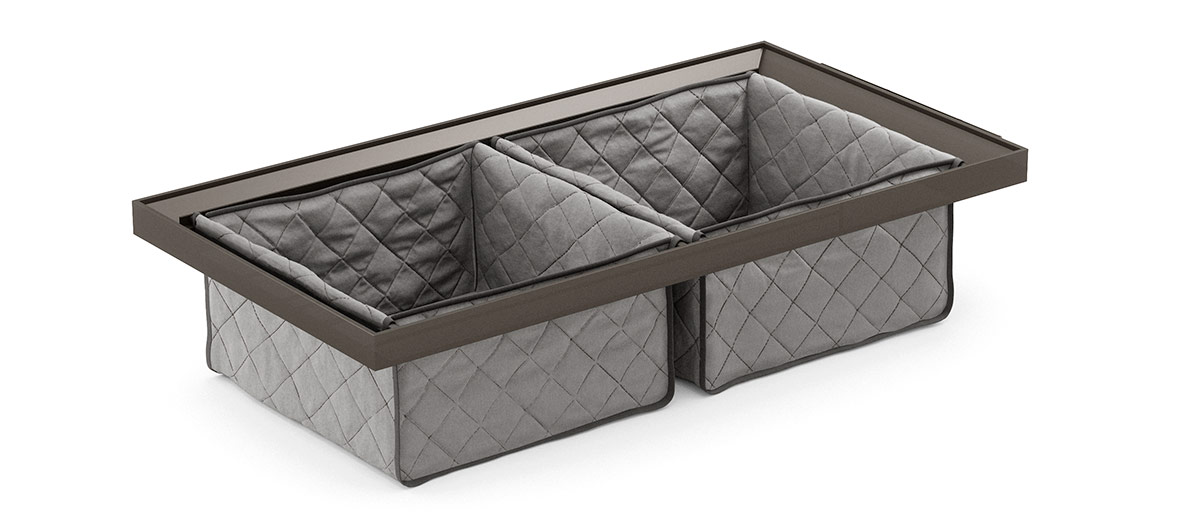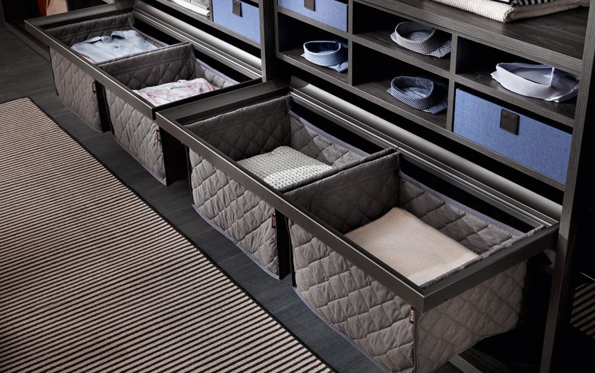 Kolekcija uključuje različite dodatke za ladice: vješalice za hlače, žičane ili metalne nosače za obuću te pretince za posteljinu izrađene od prošivene tkanine.