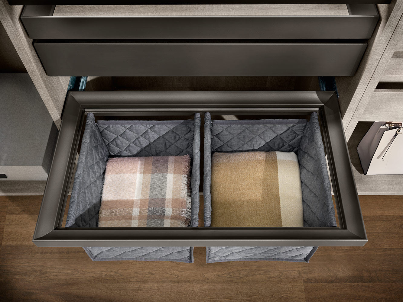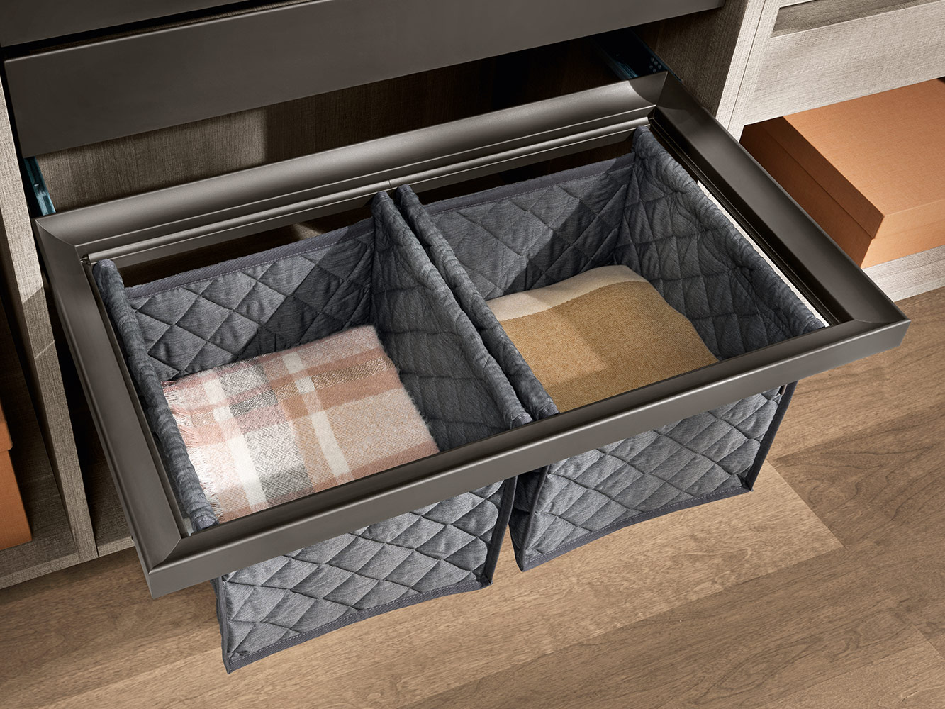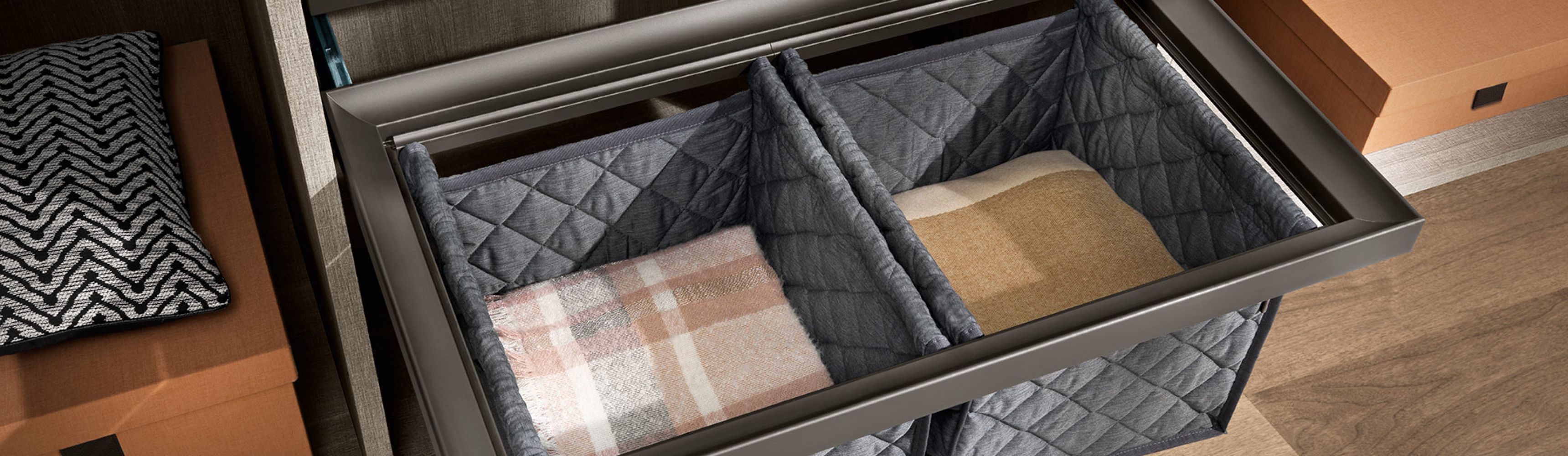 Kolekcija uključuje različite dodatke za ladice: vješalice za hlače, žičane ili metalne nosače za obuću te pretince za posteljinu izrađene od prošivene tkanine.