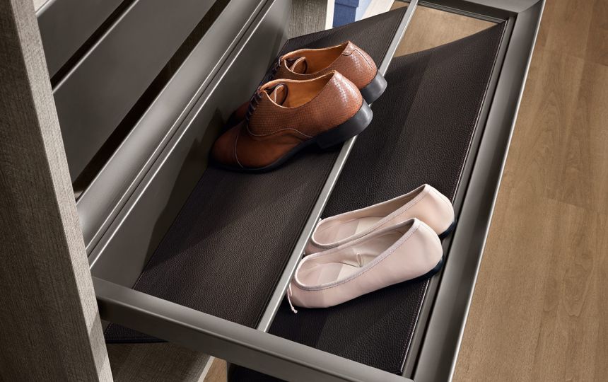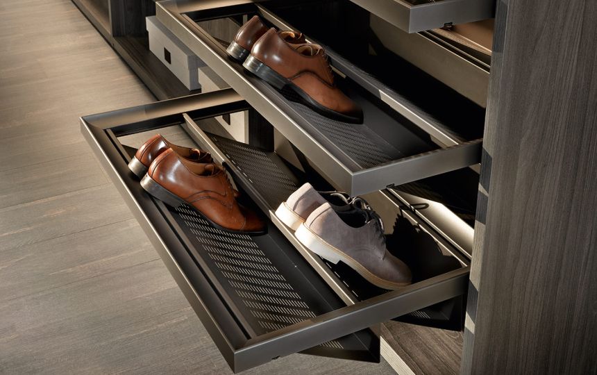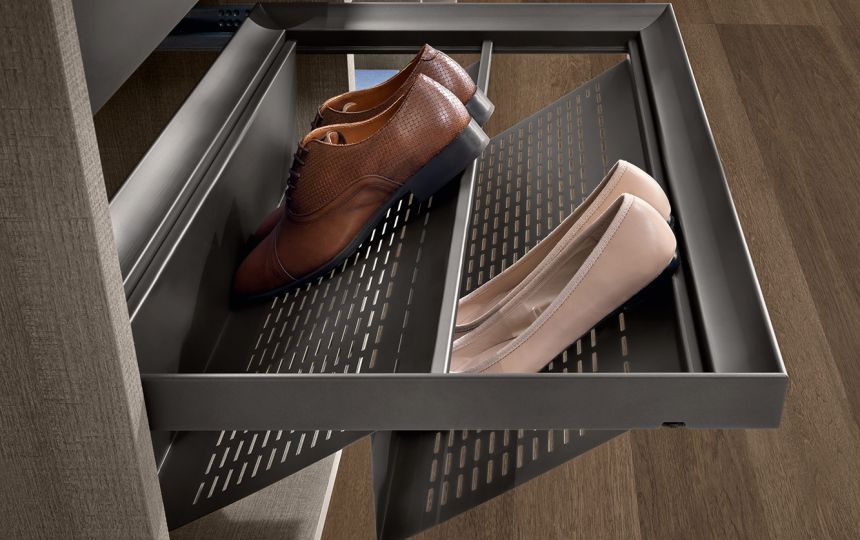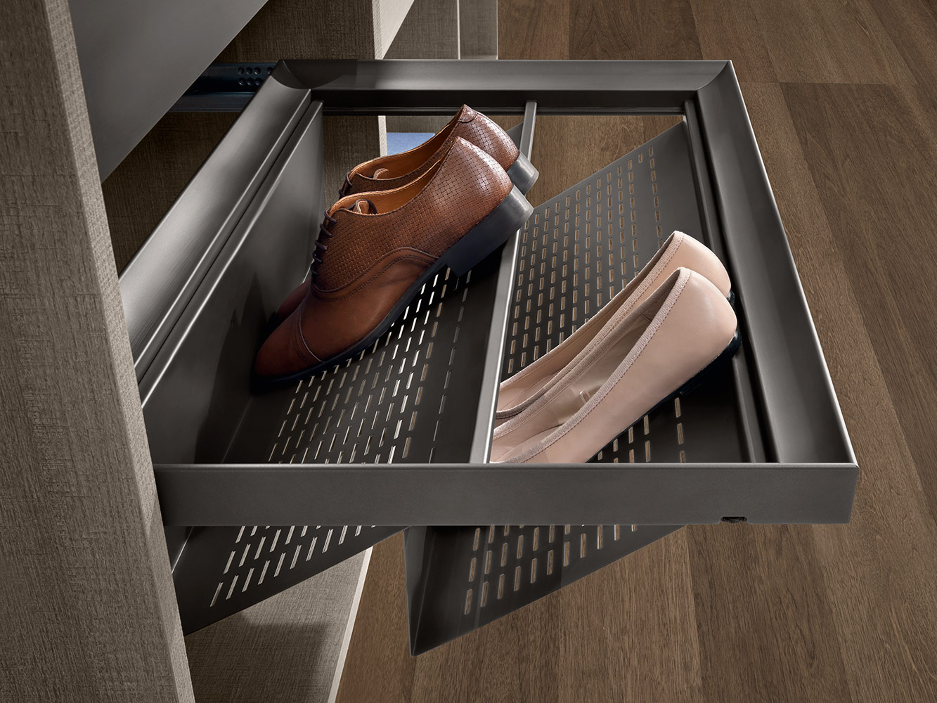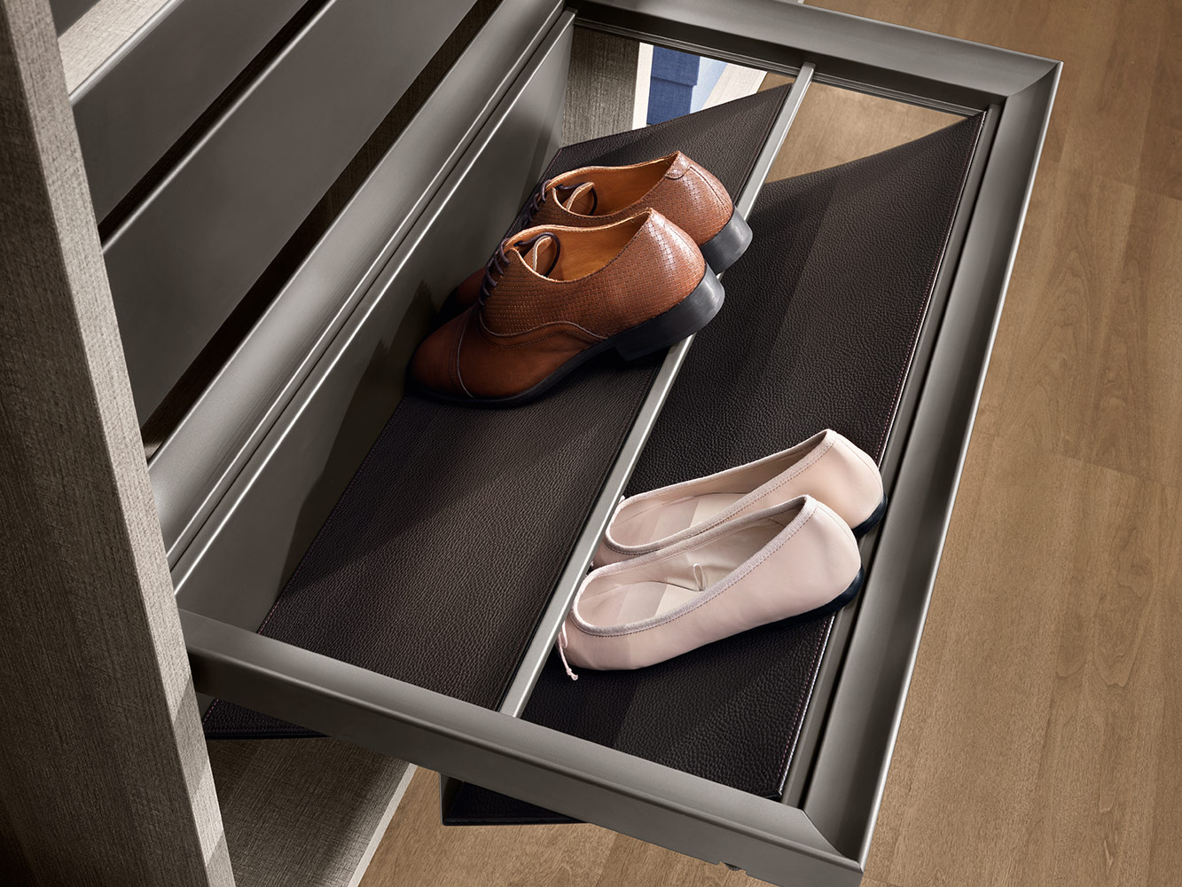 Kolekcija uključuje različite dodatke za ladice: vješalice za hlače, žičane ili metalne nosače za obuću te pretince za posteljinu izrađene od prošivene tkanine.
