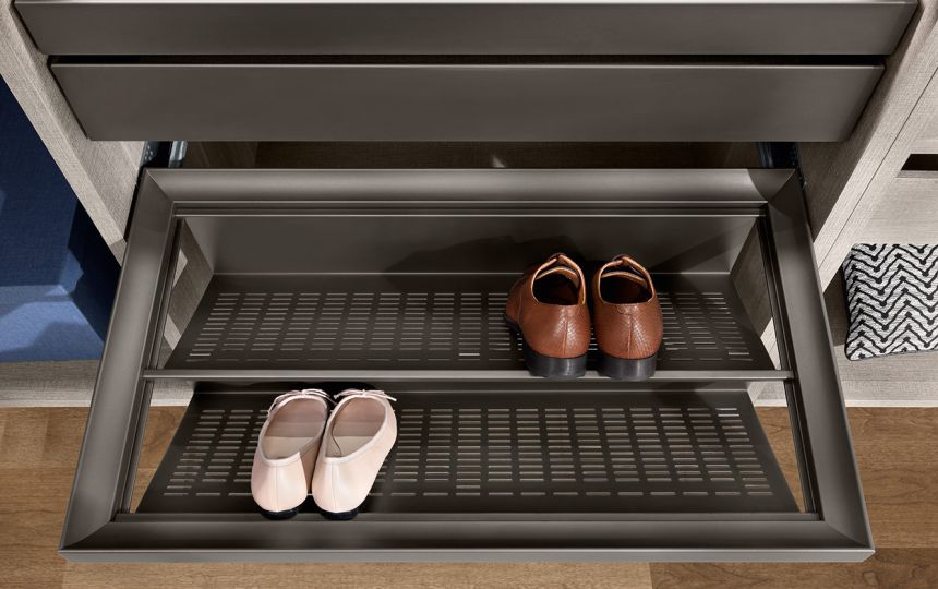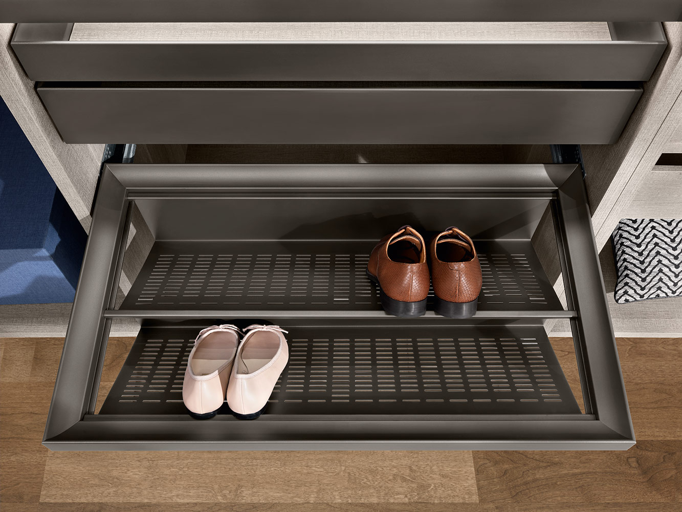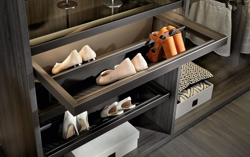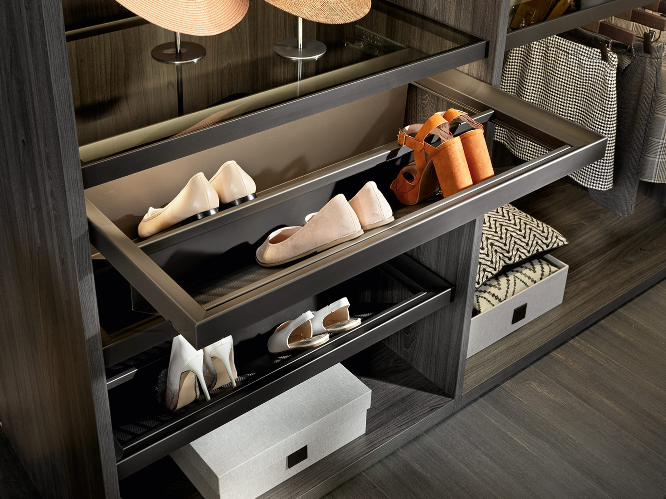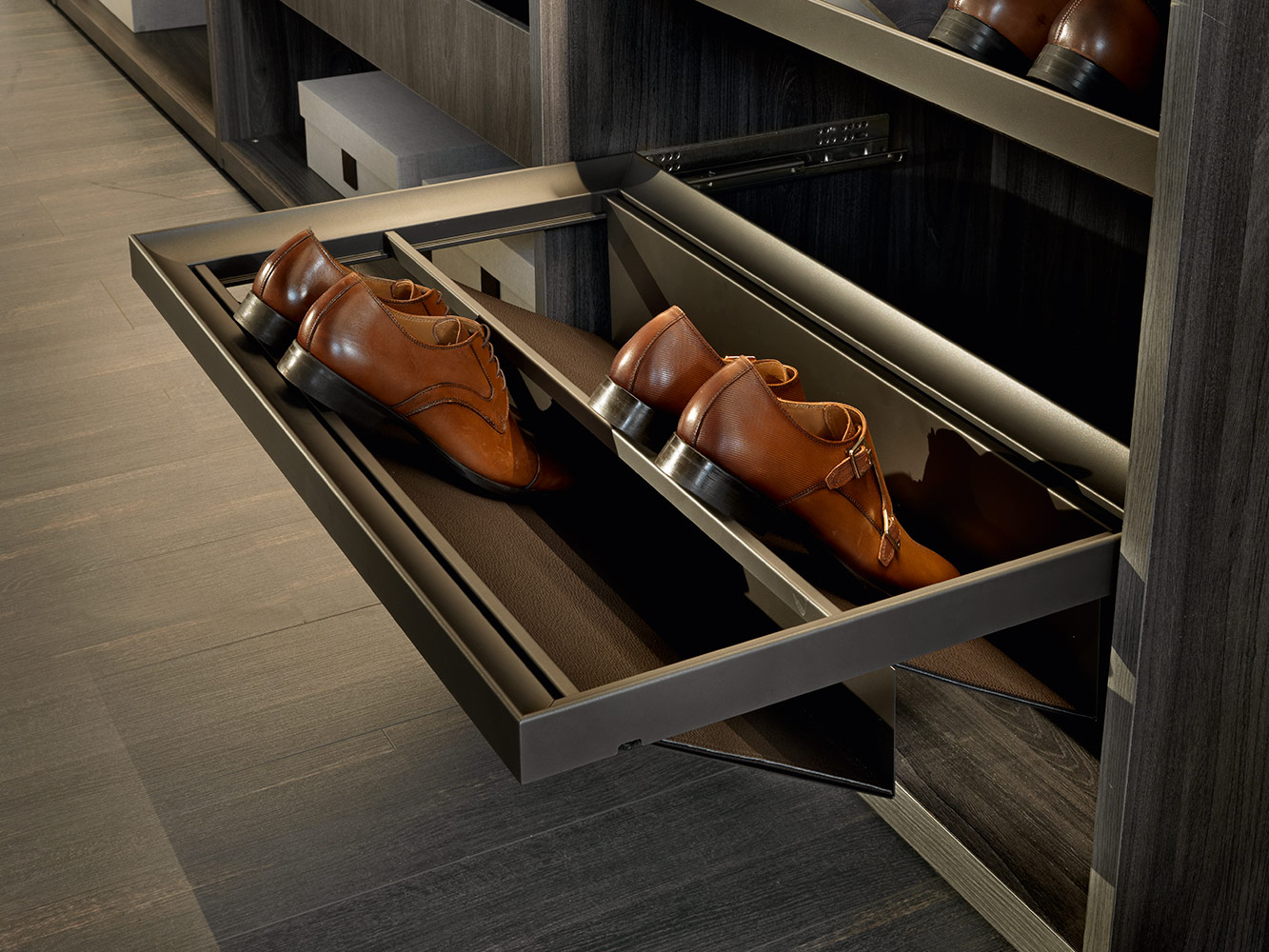 Kolekcija uključuje različite dodatke za ladice: vješalice za hlače, žičane ili metalne nosače za obuću te pretince za posteljinu izrađene od prošivene tkanine.