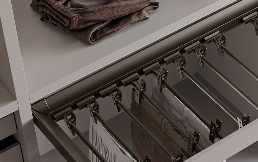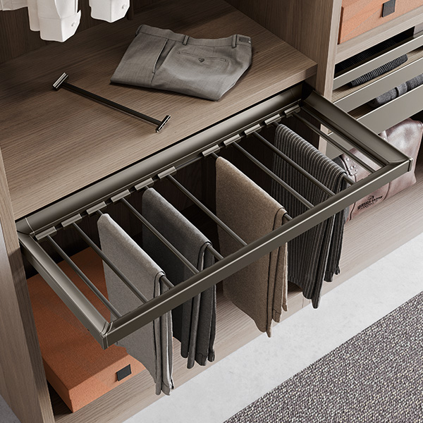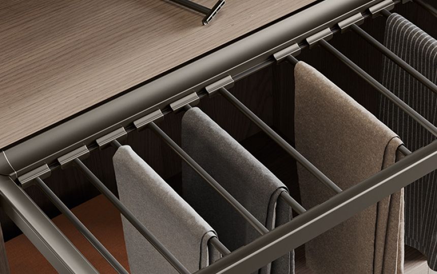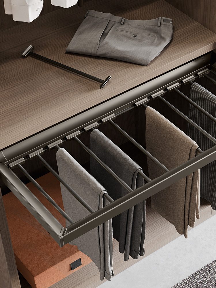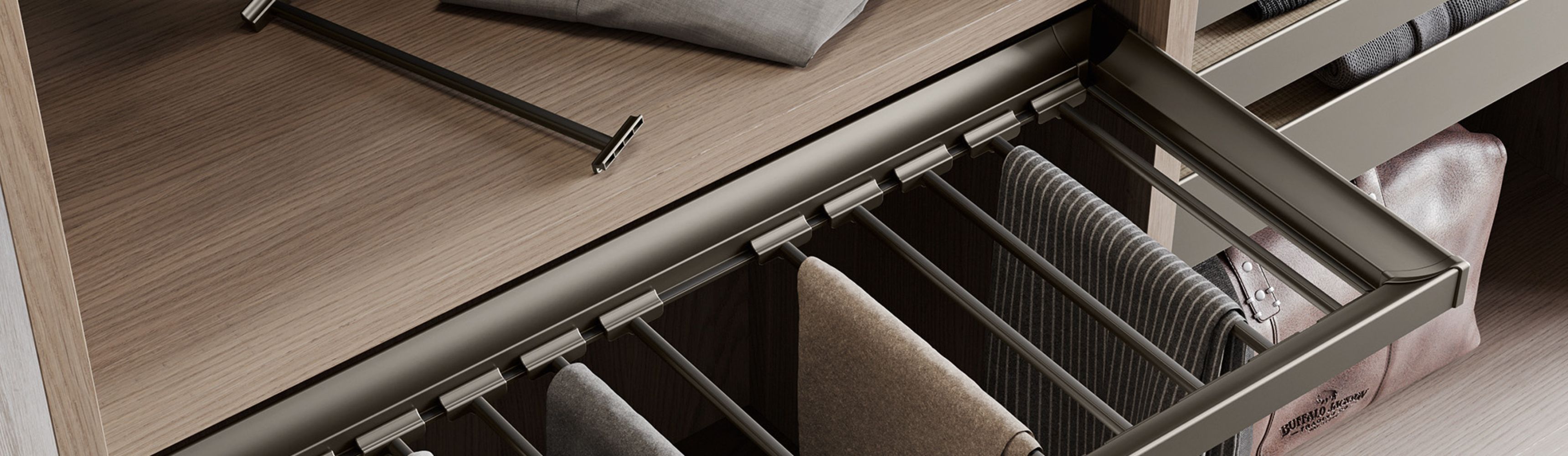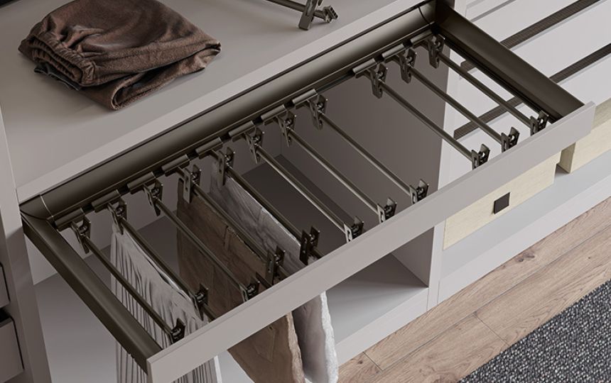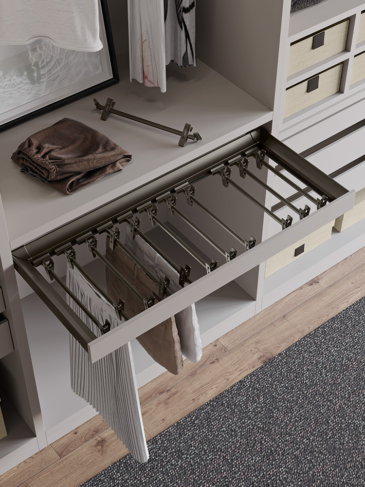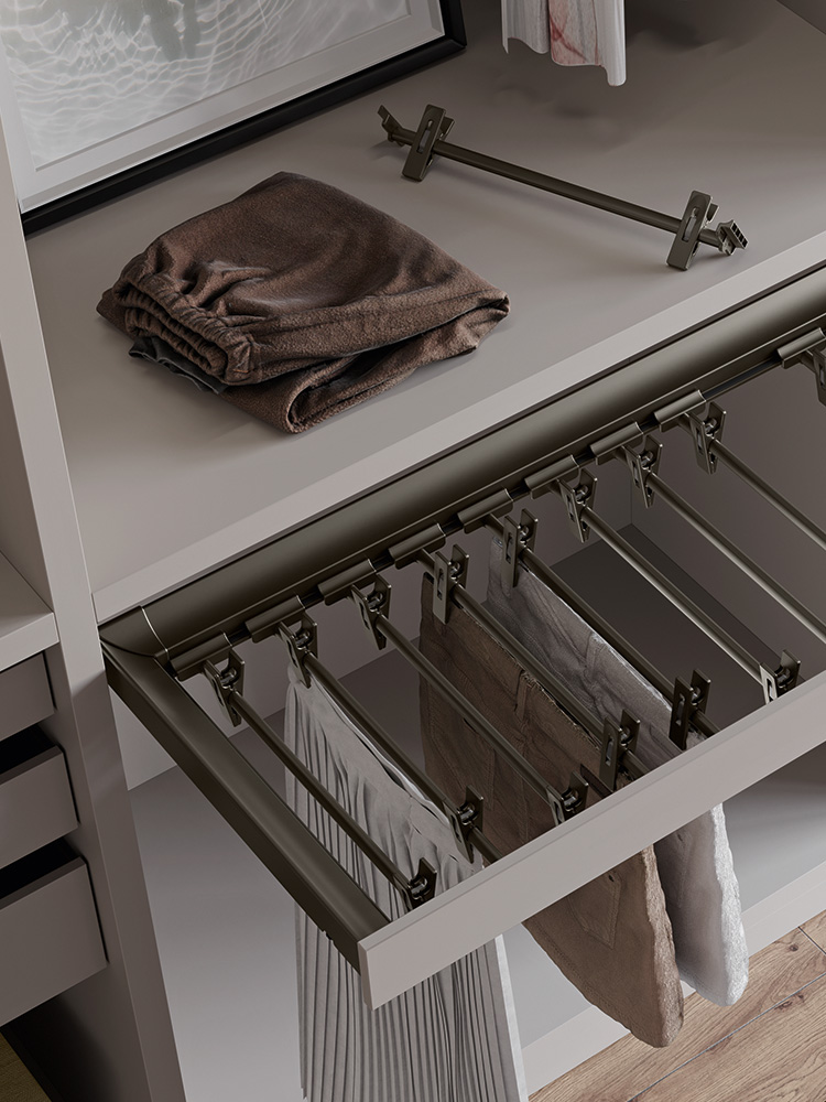 Različiti dodaci za ladice uključeni su u kolekciju: vješalice za hlače i suknje, žičane ili metalne police za cipele te pretinci za posteljinu izrađeni od prošivenog tekstila.