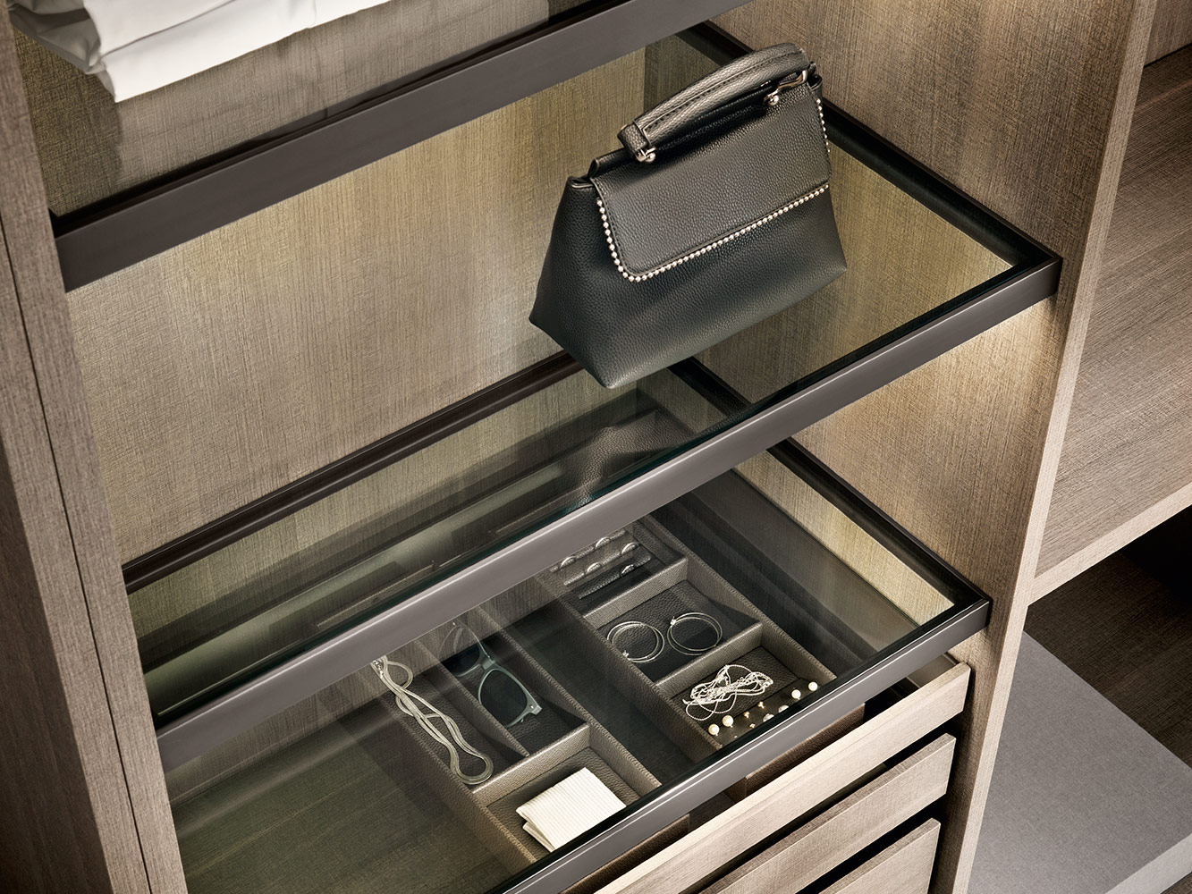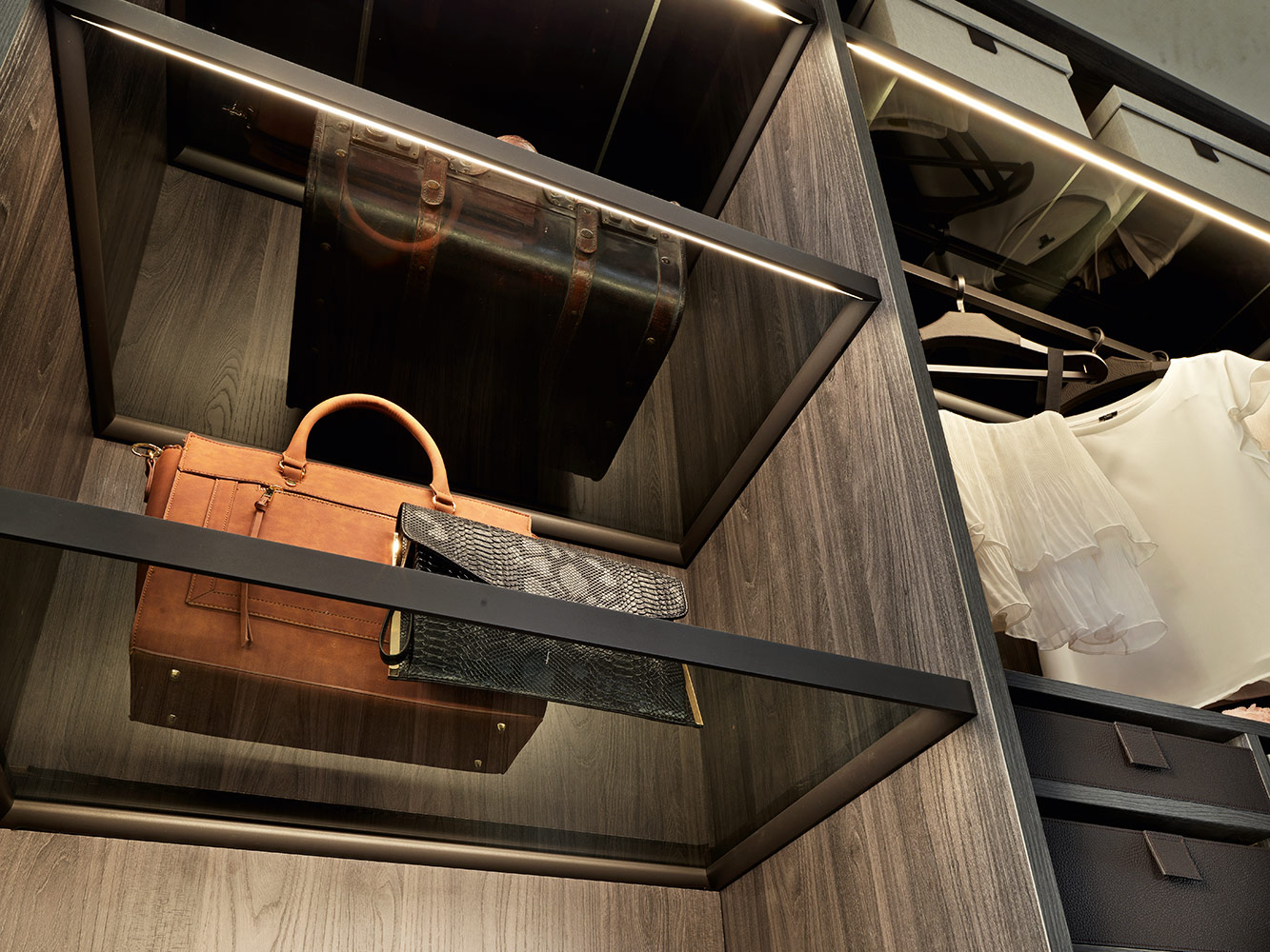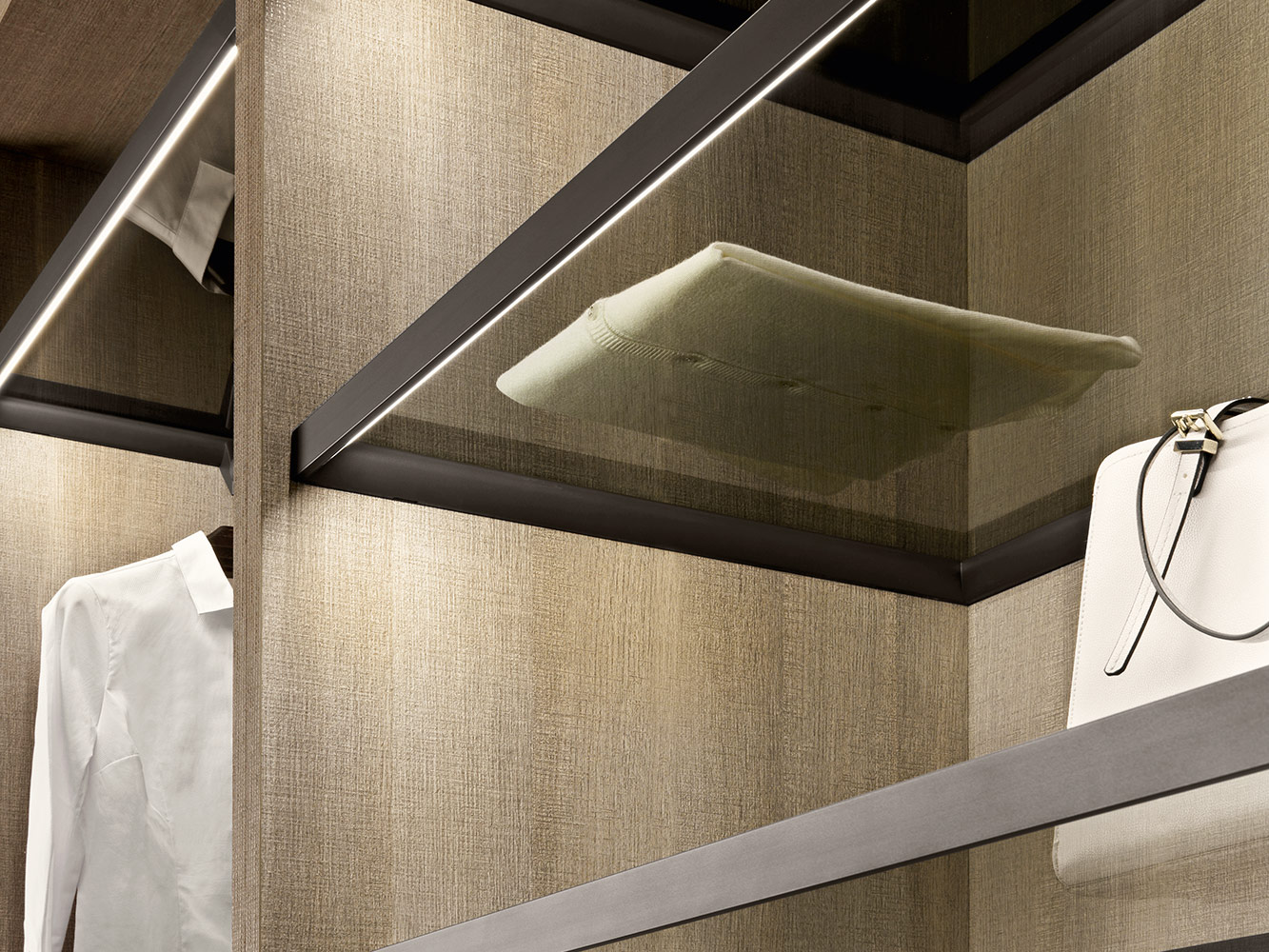 Danas, svjetlo igra ključnu ulogu u ormarima s prolazom. Osvijetljene police iz ove kolekcije oživljavaju odjeću i dodatke; ormar se osvjetljava i animira sve pohranjene predmete. Sustav rasvjete je savršeno skriven, a donje strane polica, izrađene od stakla, dodatno pojačavaju svjetlost i luminiscenciju. Vješalica za odjeću i posebna, precizna izrada njenih nosača, upotpunjuju i ukrašavaju dizajn proizvoda.
