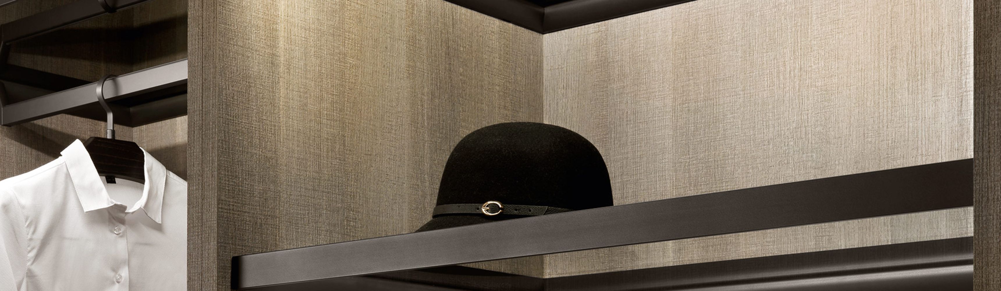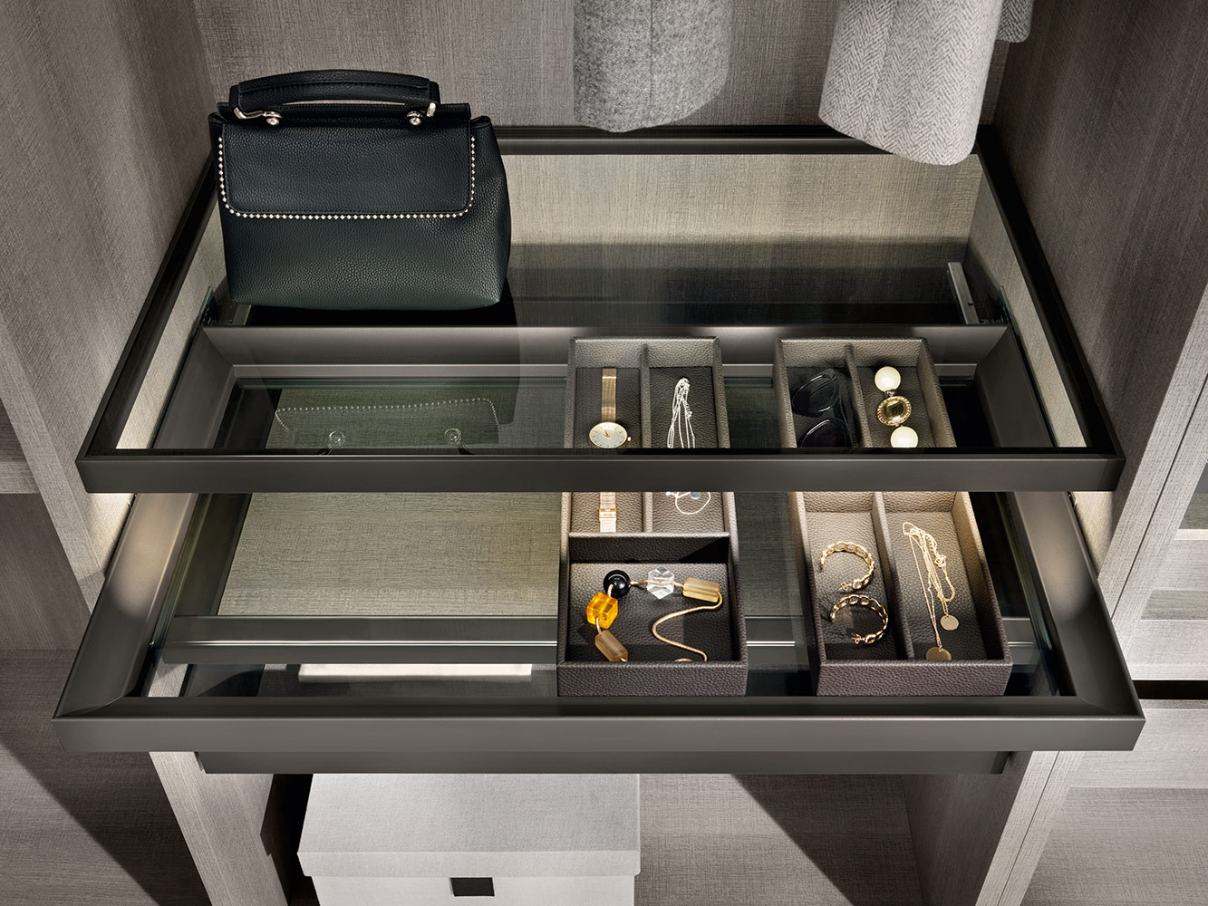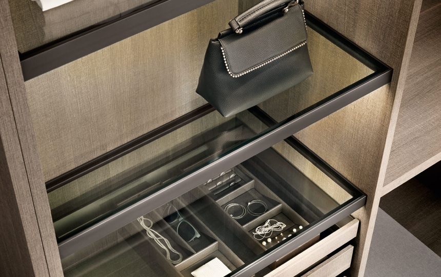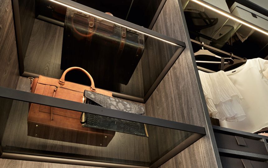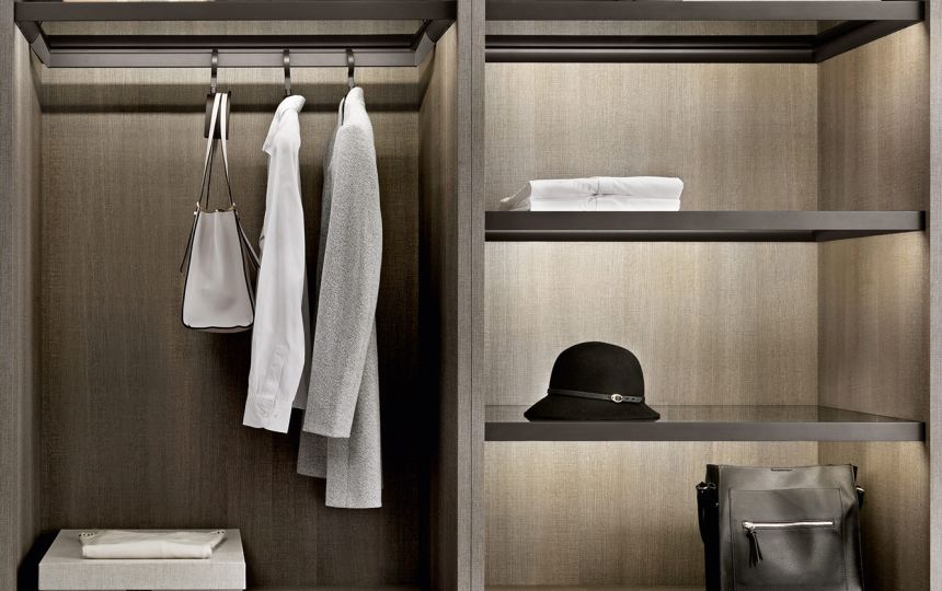 Danas, svjetlo igra ključnu ulogu u ormarima s prolazom. Osvijetljene police iz ove kolekcije oživljavaju odjeću i dodatke; ormar se osvjetljava i animira sve pohranjene predmete. Sustav rasvjete je savršeno skriven, a donje strane polica, izrađene od stakla, dodatno pojačavaju svjetlost i luminiscenciju. Vješalica za odjeću i posebna, precizna izrada njenih nosača, upotpunjuju i ukrašavaju dizajn proizvoda.