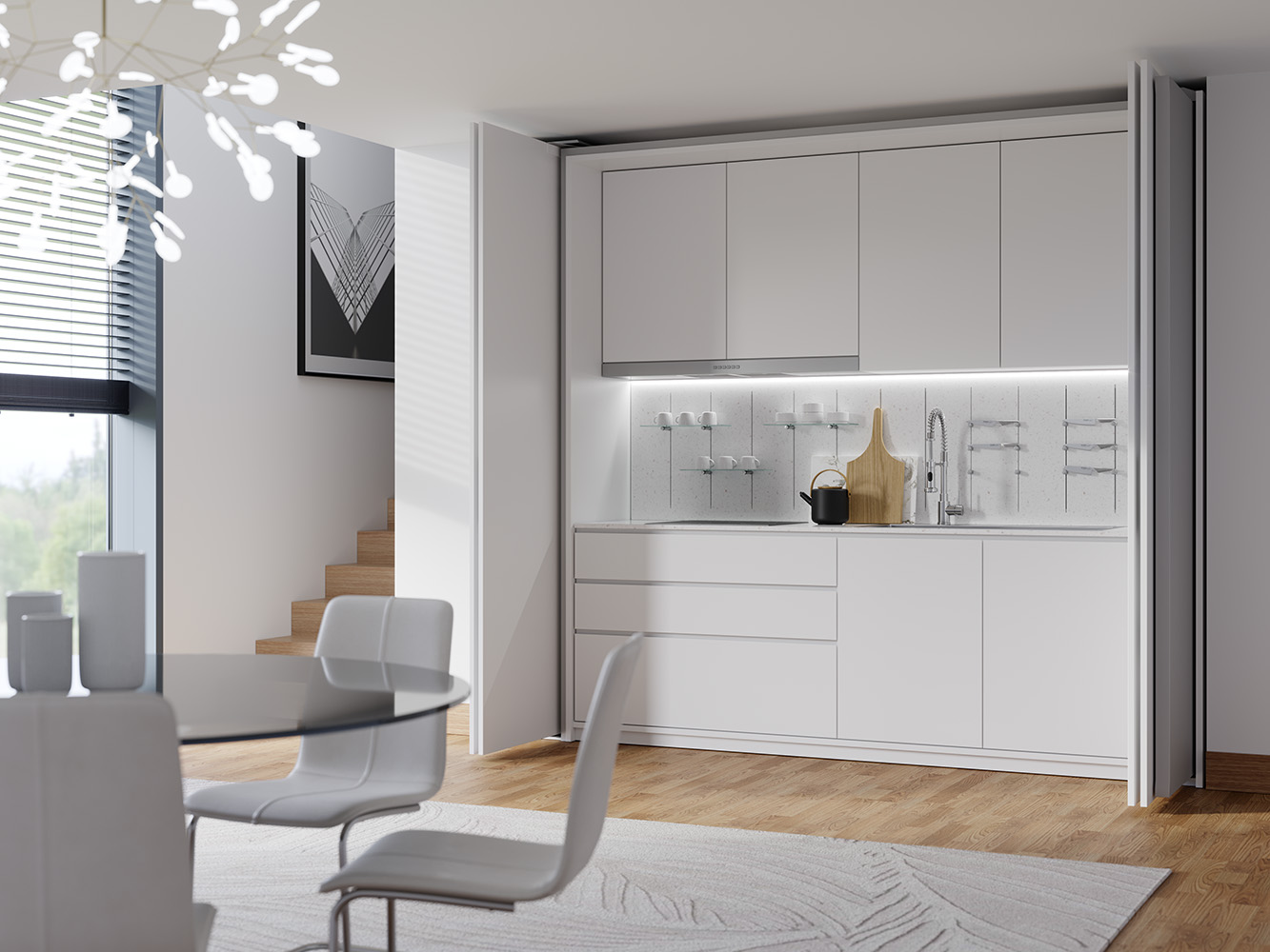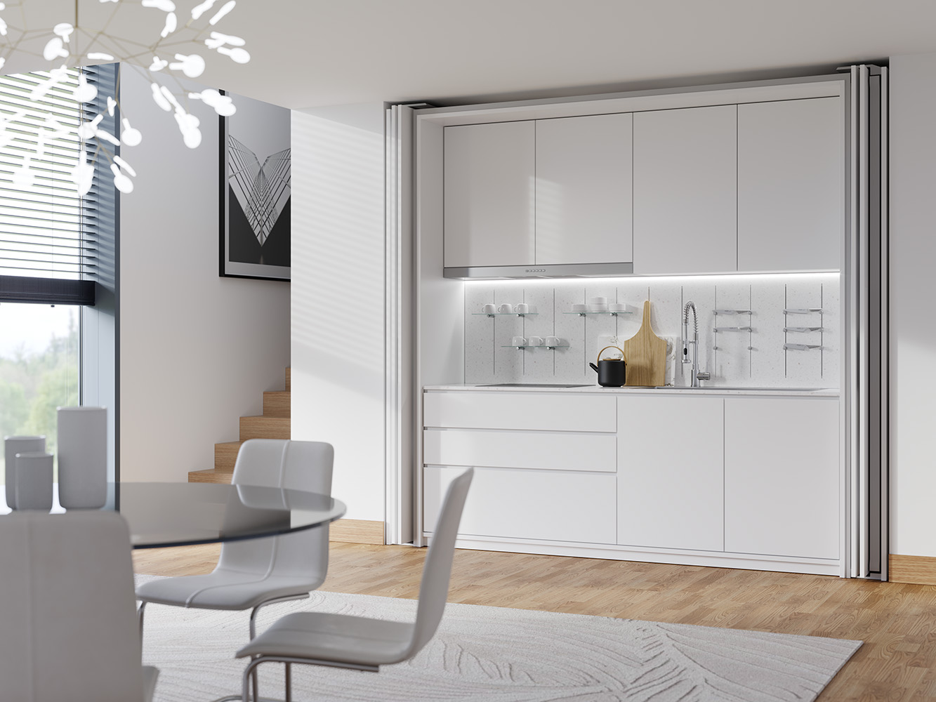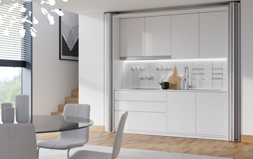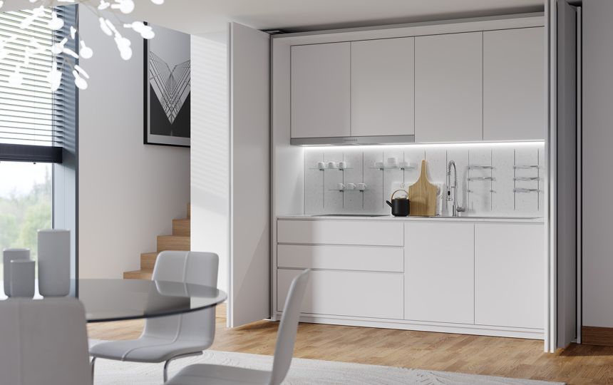 Cijeli mehanizam je samonosiv i pričvršćen za bočnu stranu ormara; ne zahtijeva prednje nosive profile ni na gornjoj ni na donjoj strani, čime se eliminira potreba za dodatnim središnjim potpornjima. Zahvaljujući sustavu za kontrolu kretanja, ručka se može postaviti na rub vrata, omogućujući otvaranje i zatvaranje jednom rukom. Osim toga, uz električni Push komplet, moguće je obje verzije koristiti na namještaju bez ručki.