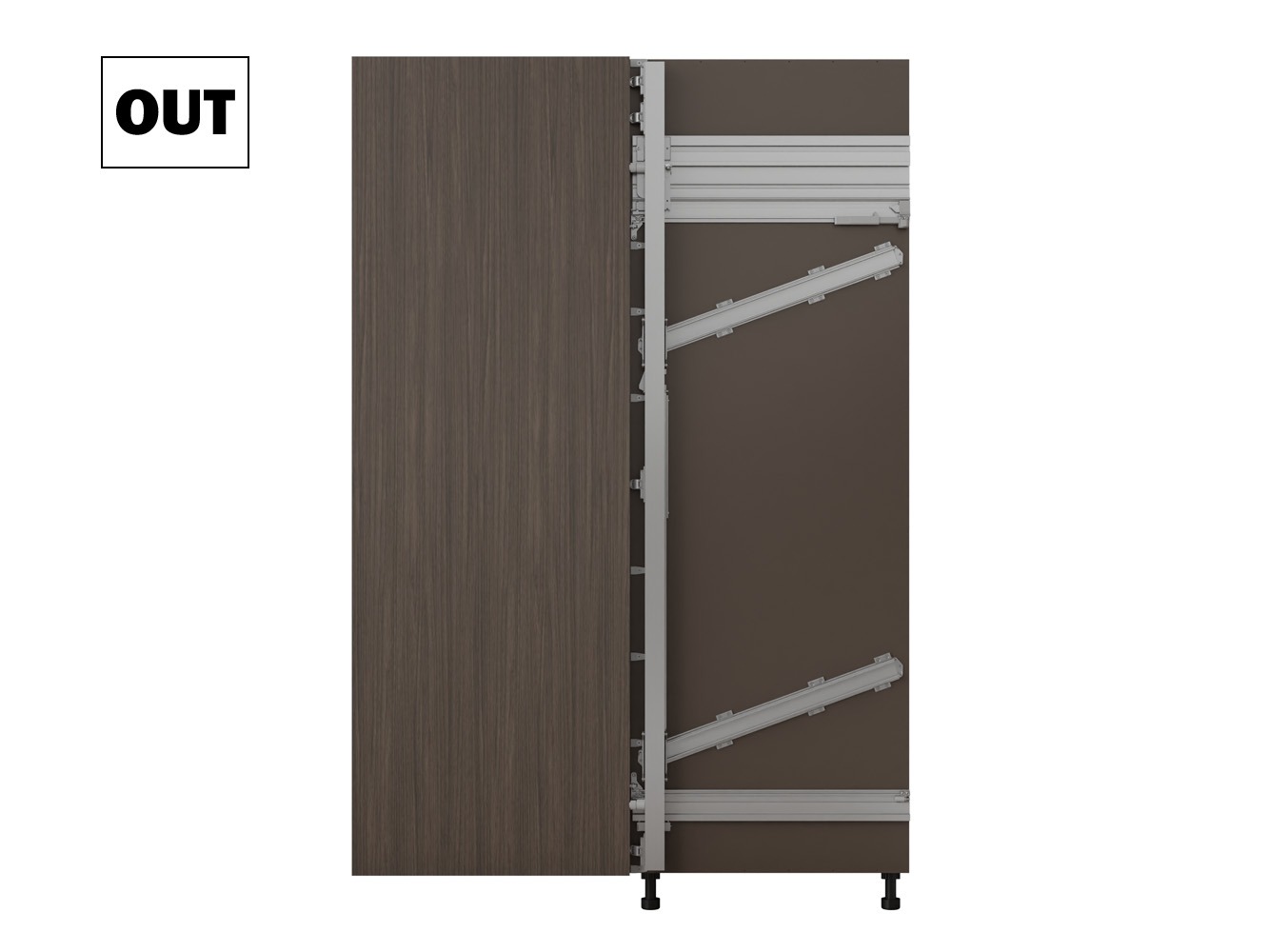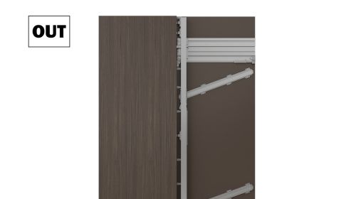 OUT (Push): Vrata se automatski otvaraju iz unutrašnjosti ormara laganim dodirom, uz potpomognuti pokret.