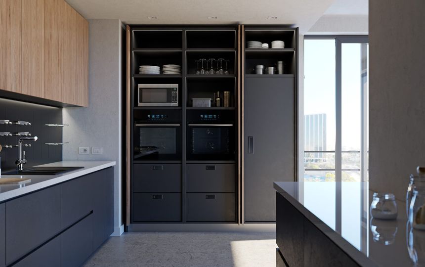 Exedra Gravity može se isporučiti sa sustavom Smove za usporeno zatvaranje, ili s Push to open spojnicama za vrata bez ručkica.