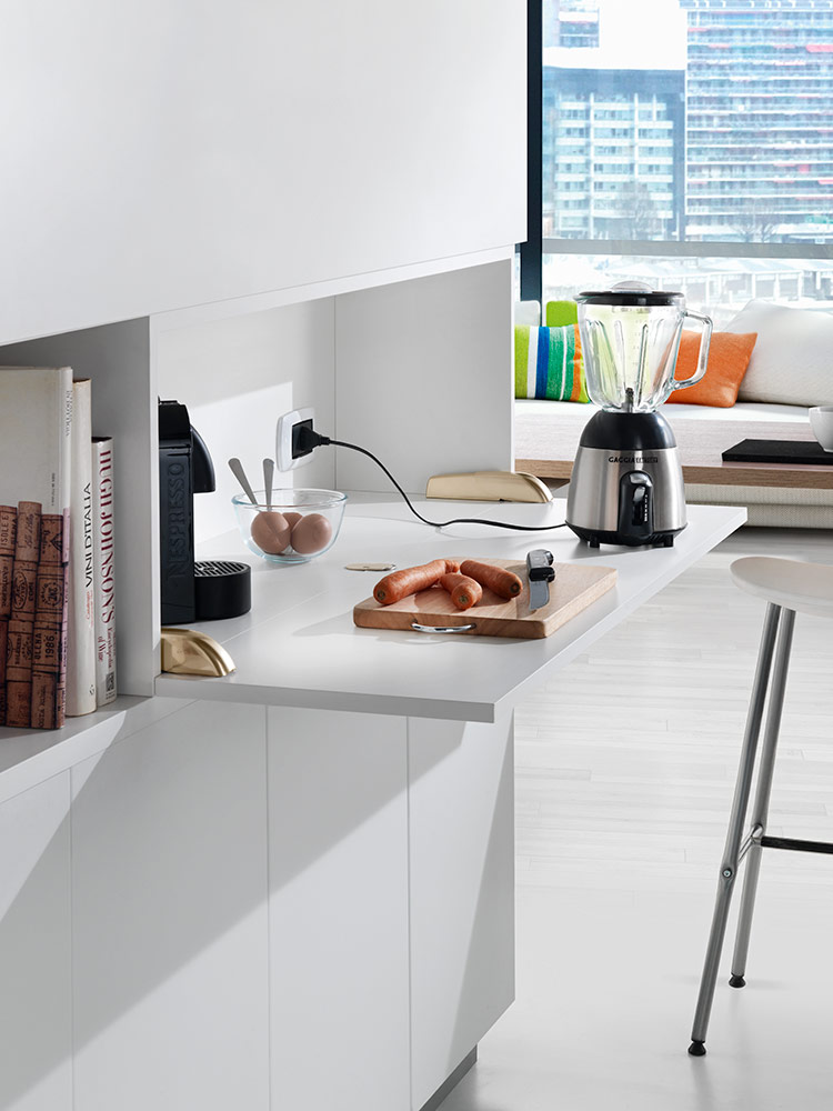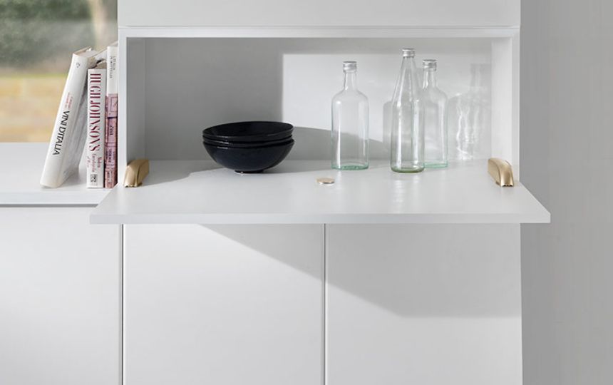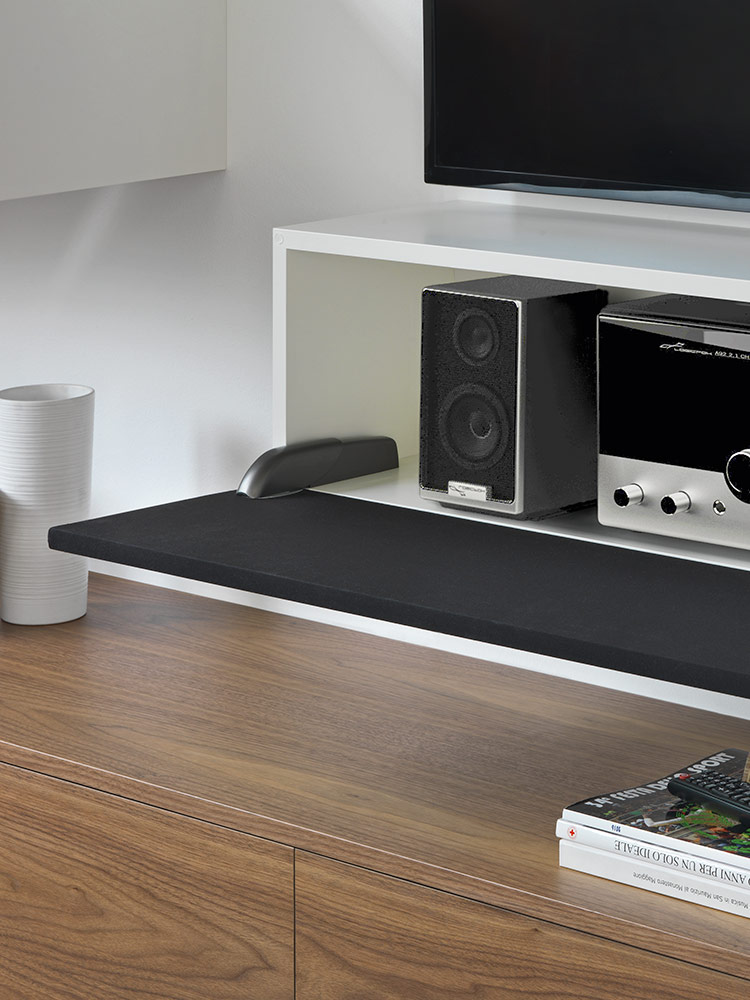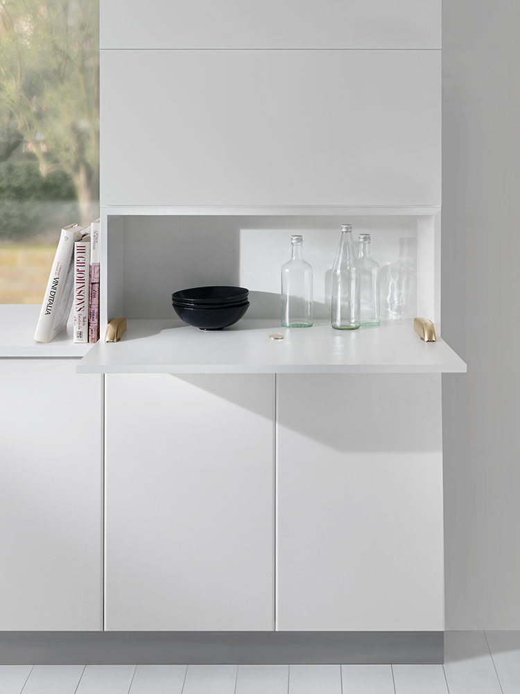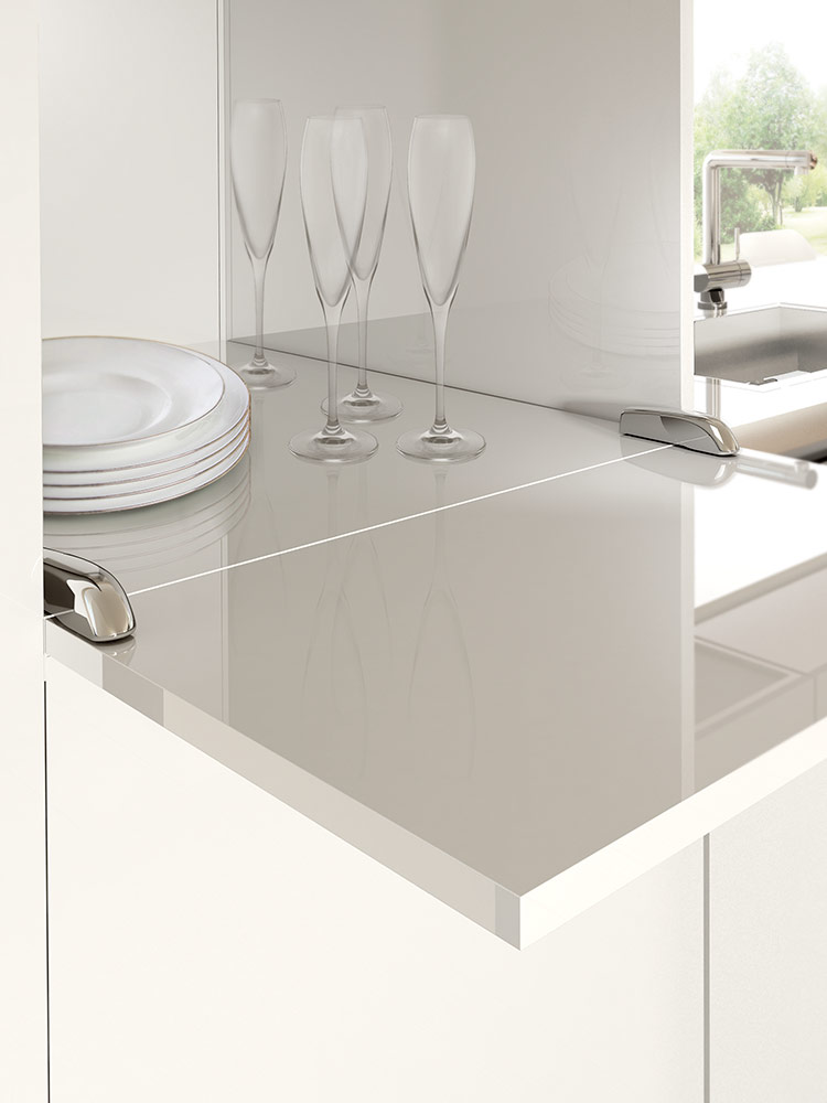 U potpuno otvorenom položaju, vrata i donja ploča su poravnati, stvarajući ravnu i ujednačenu površinu.